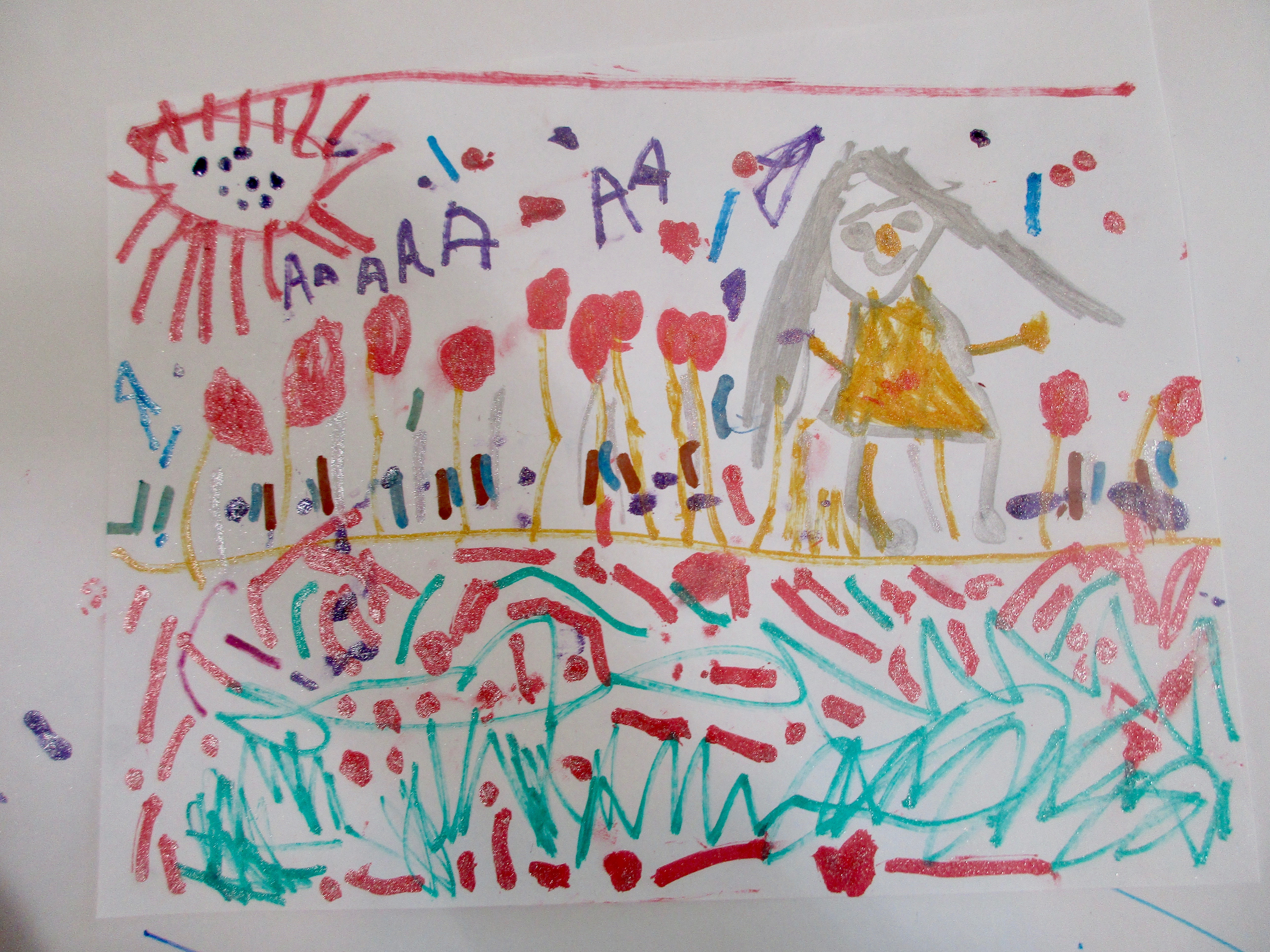 Roen: It’s me picking flowers. All the A’s are the joy of my heart. My mom is so nice and I love her sooo much. My heart beats so big for her!