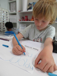 At the East Wing Communication Center, popular laminated phrases are kept in a box to provoke writing. Some children start with a drawing that inspires words.