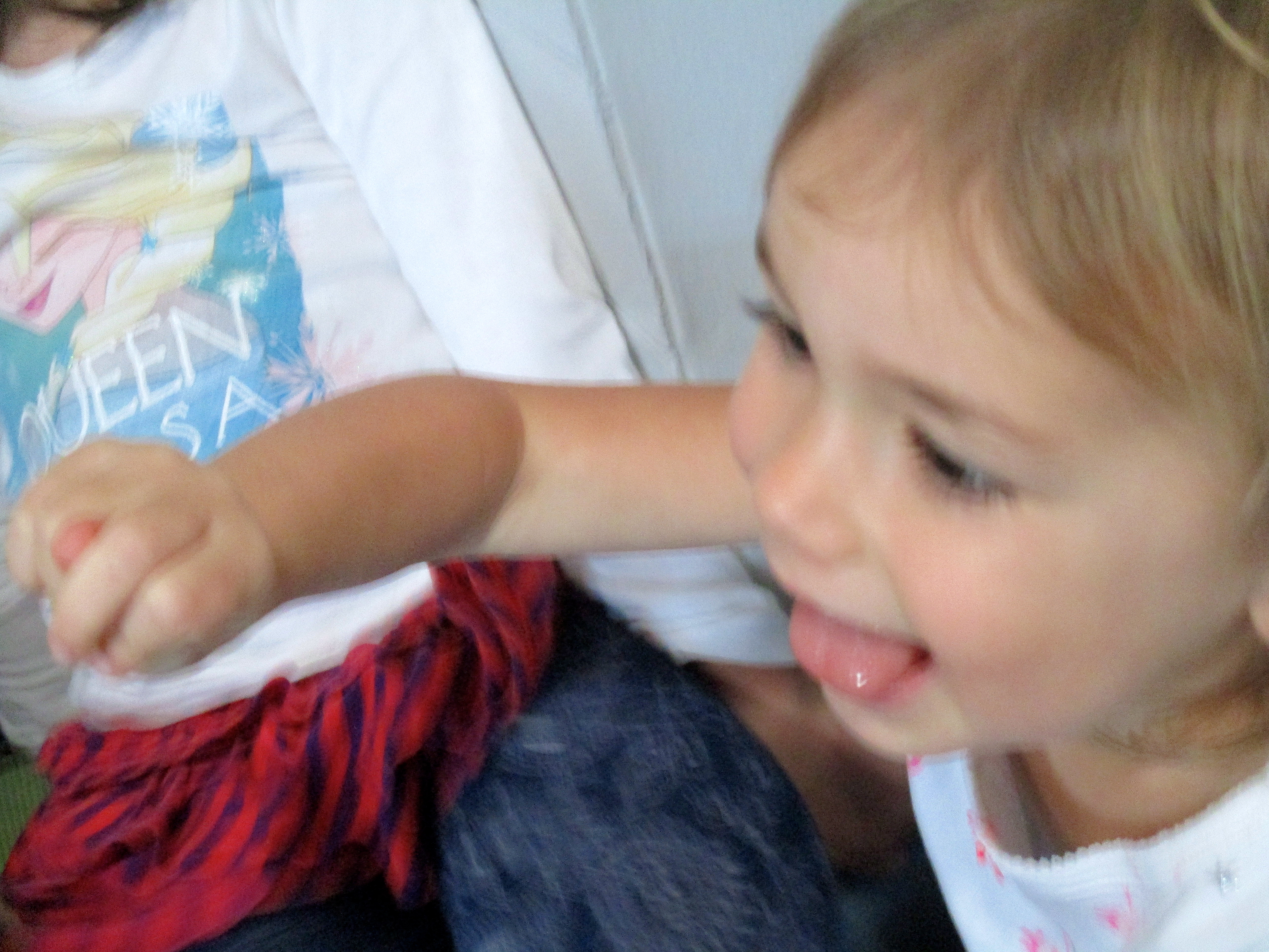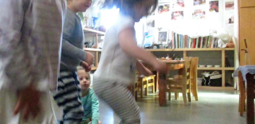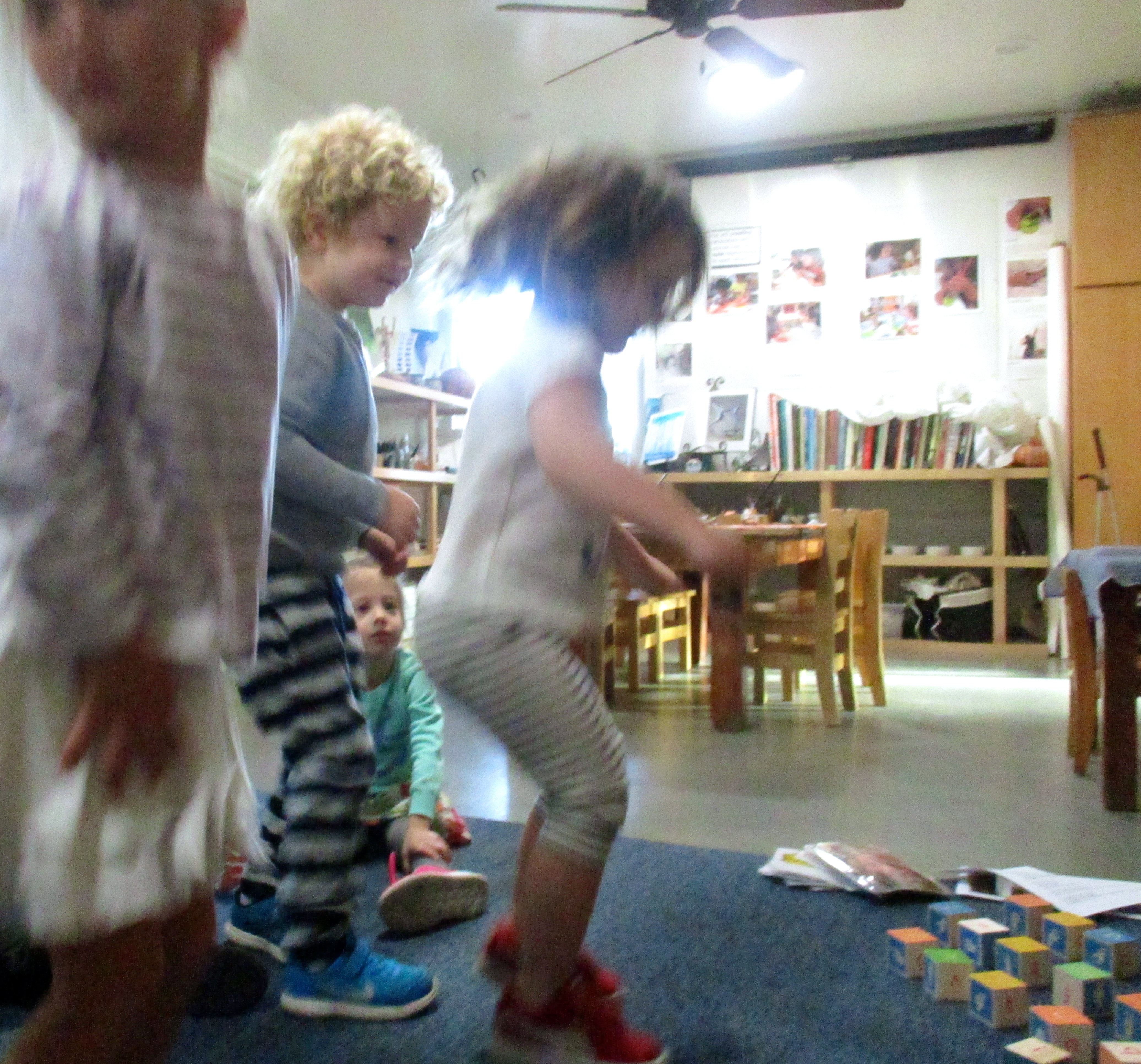 Luscia, Milo, and India stood up and did the short dance they usually do when Jenn sings: Dancing in a circle, circle, circle, dancing in a circle and then you sit down, and then you sit down.