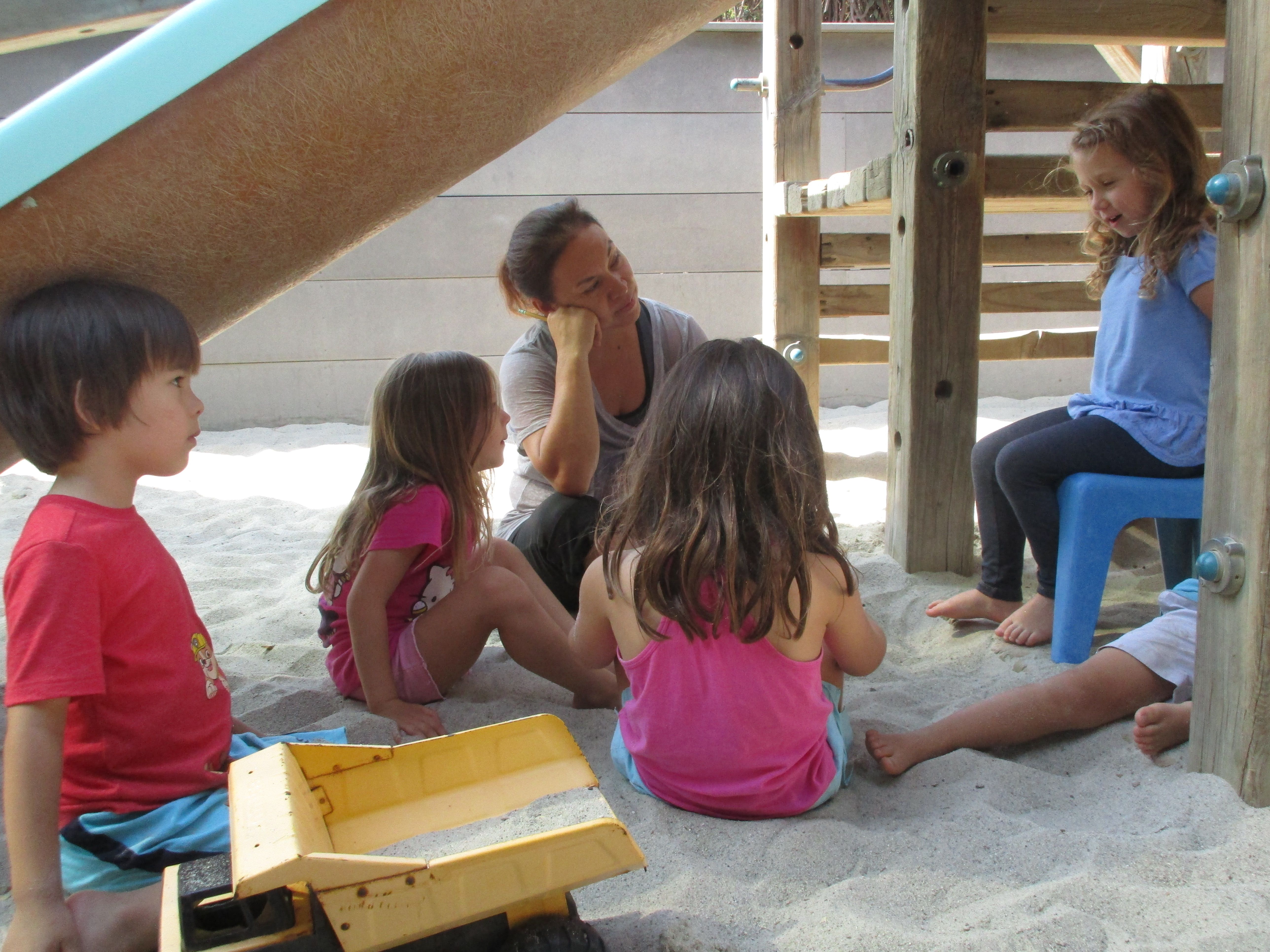 Under the Sand Area structure, Teacher Flora noticed an opportunity to practice listening skills in a naturally unfolding game. Harel set herself up as a storyteller and sat in a seat on the lower platform. The children playing under the slide formed an audience. When she finished her story, Isla continued it creating a threaded game. Flora picked up on the game and reinforced agreements on how to play. Password: venice1987