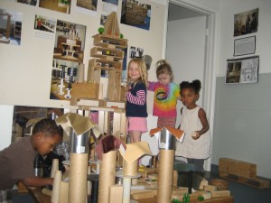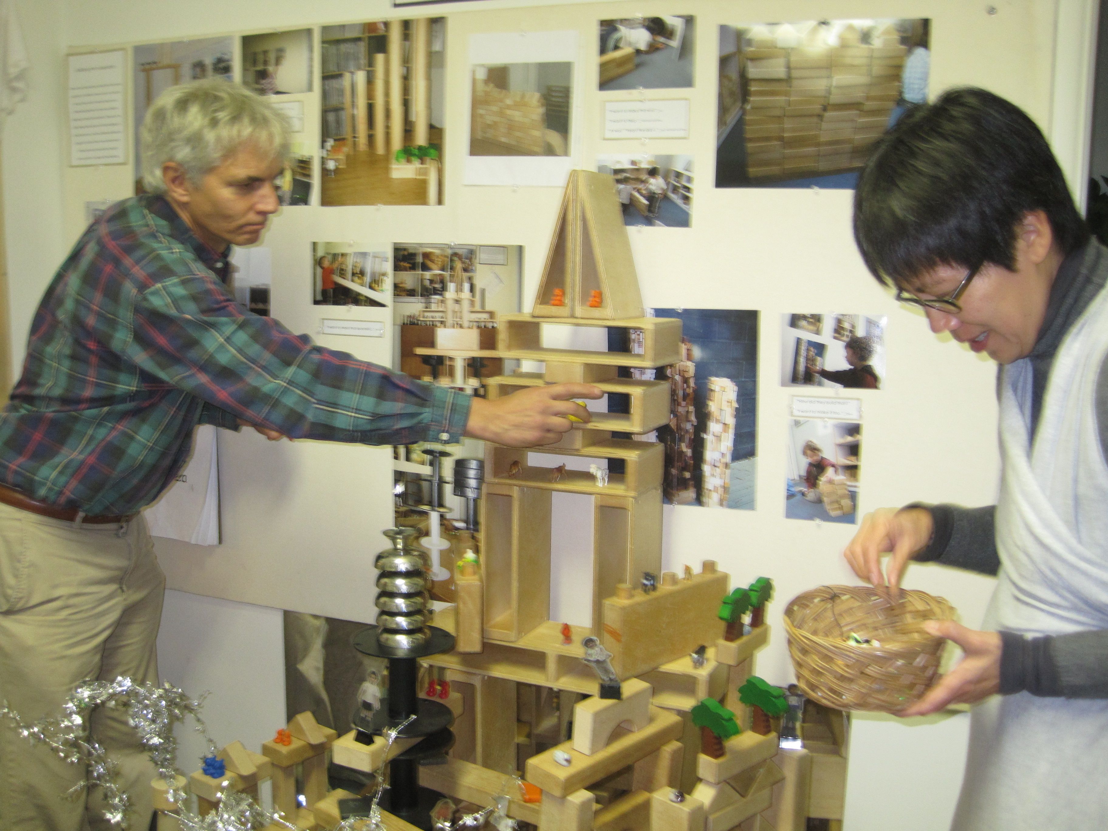 The children began working with the structure and decided to leave the tallest tower up in the back of the platform where they hid surprises for each other.