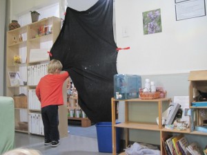 Jake peeks at the ‘surprise’ left by his dad Jeffrey and other parents in the block area.