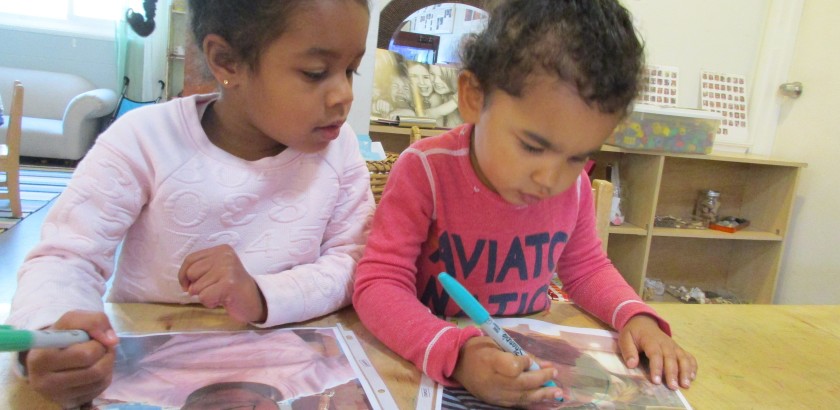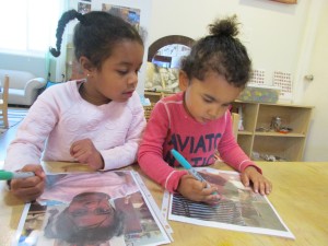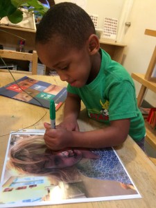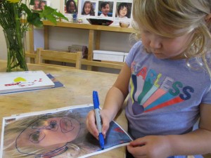 We also began to see the children becoming more attached to who is in the picture rather than the nuanced meaning expressed by the face. To redirect the children back to our intention of working to better understand each other’s perspectives by learning non-verbal communication, Teacher Jessica introduced permanent markers to trace the lines and expressions of the photos onto transparency sleeves.