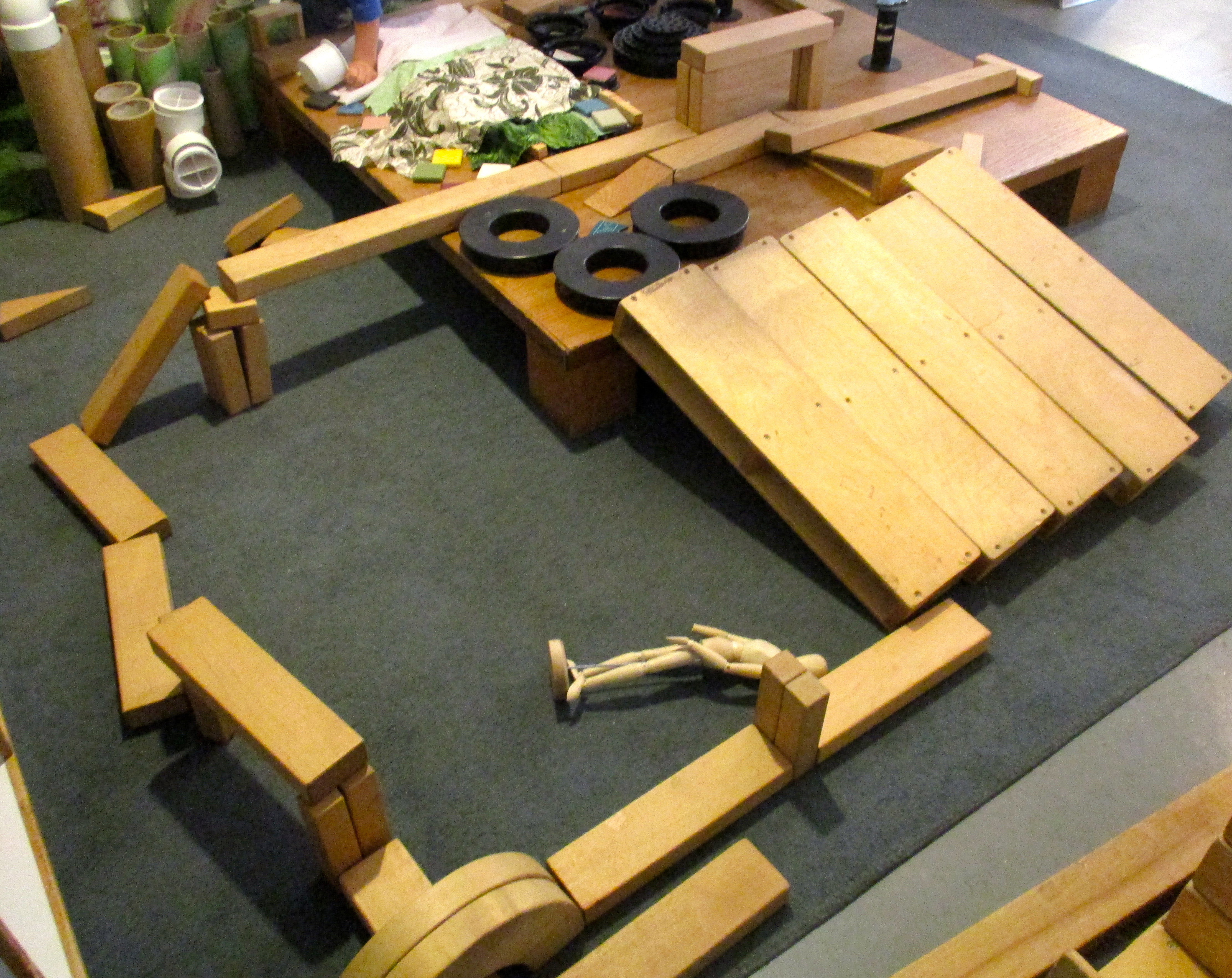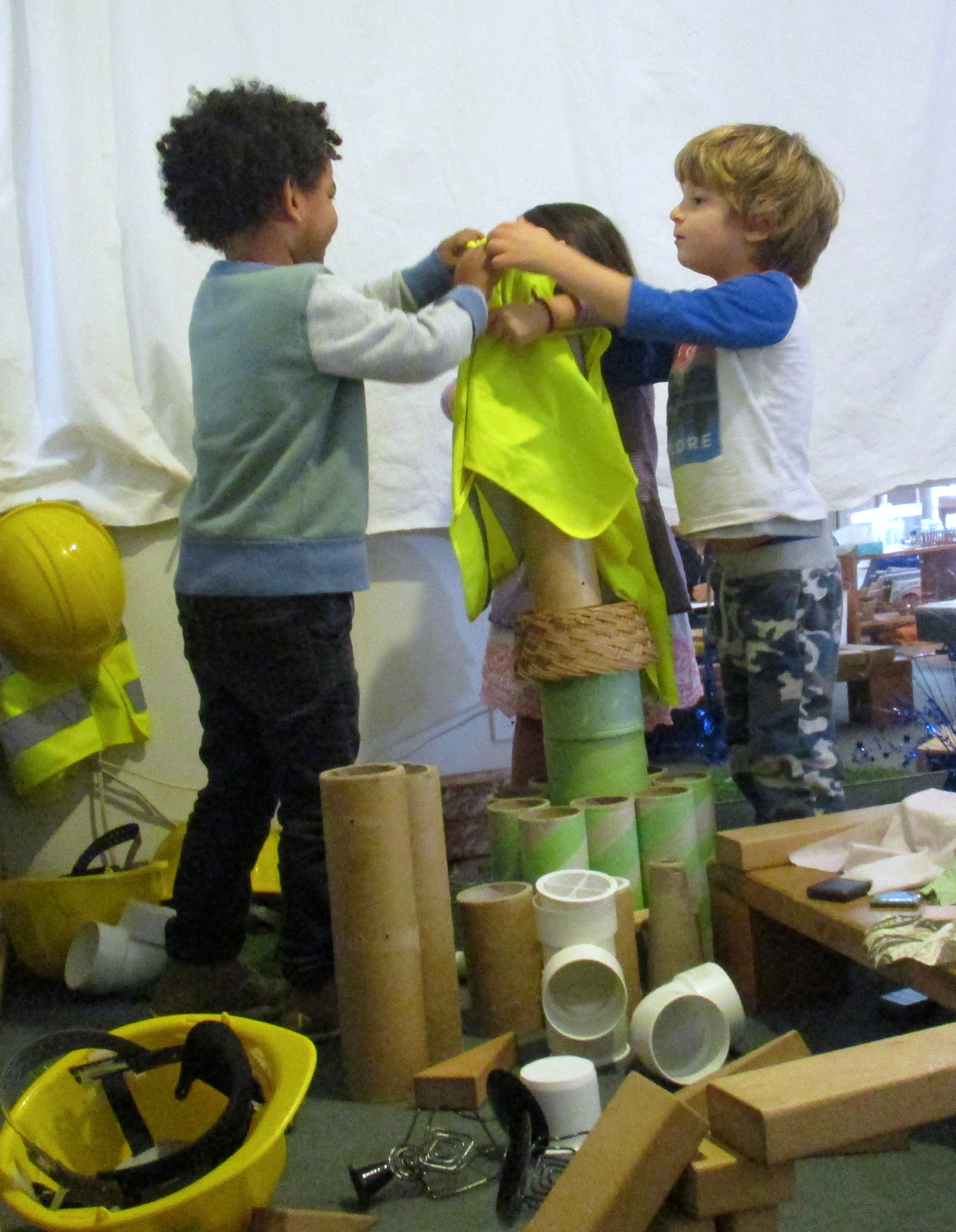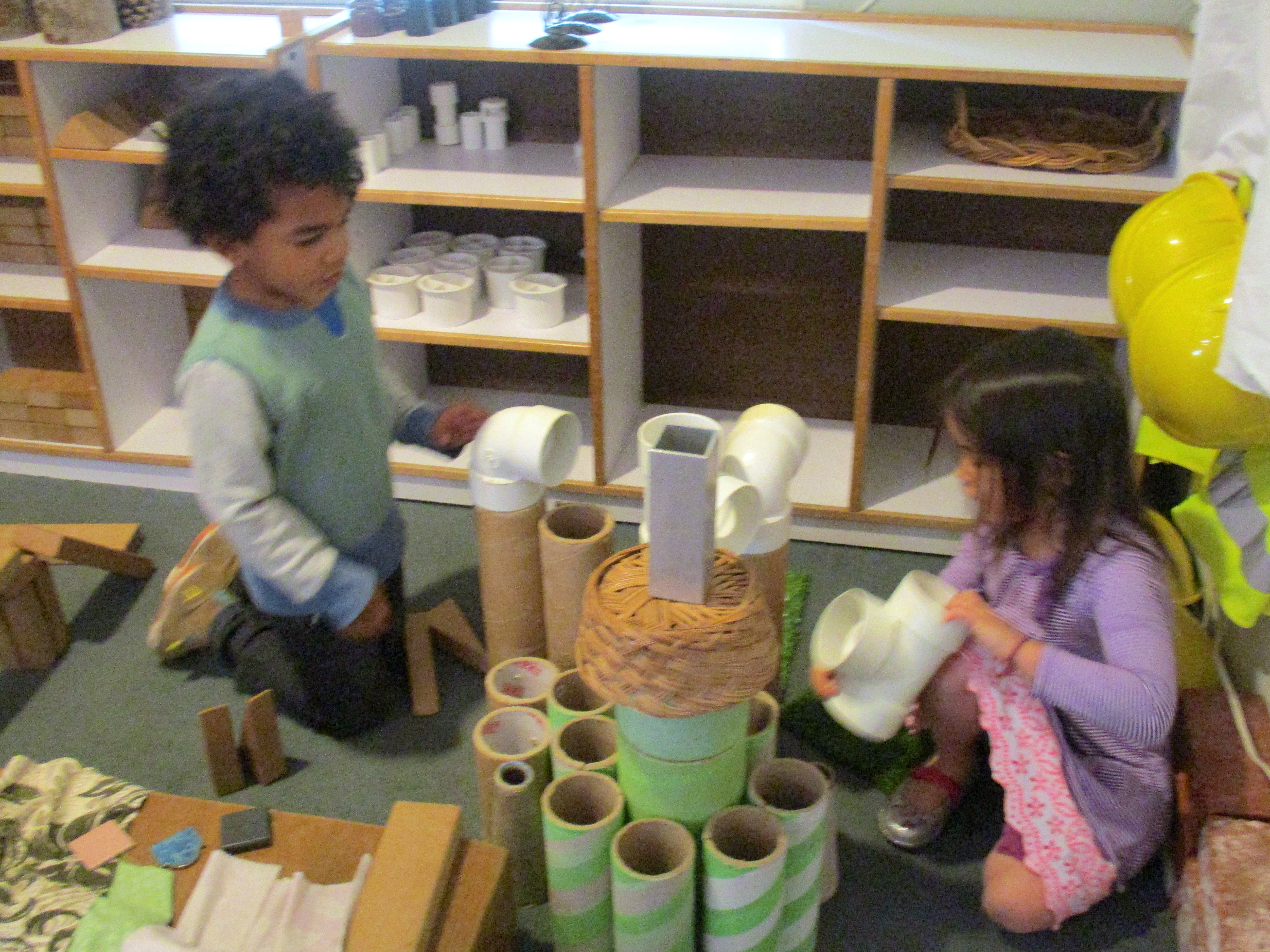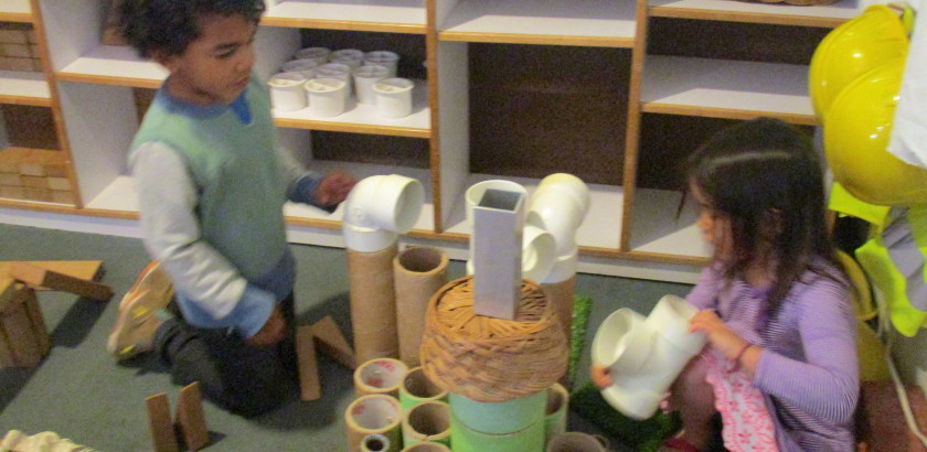 I specifically brought up the train topic to these children with the idea of gathering more information from them and to confirm their curiosity about trains as it continues to be a recurrent building plan. Jacob, Leah, and Theo were definitely receptive and trains and bridges became their reference of connection as we’re seeing with more West Wingers. It is gratifying to see how the intentional placement of a variety of materials stimulates their thinking. Jacob chose the hollow blocks supported by the platform to create a tunnel and Theo used two pillar blocks to balance the double blocks for the bridge. On the other hand, Leah started discovering the connections with the recycled materials and grabbed Jacob’s and Theo’s attention to explore with her. In the end, their building was a “castle party with a bridge, tunnels, and a train with animals.” It seems like there is much to investigate about trains, tunnels, bridges, and castles and always more to learn. Teacher Flora
