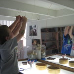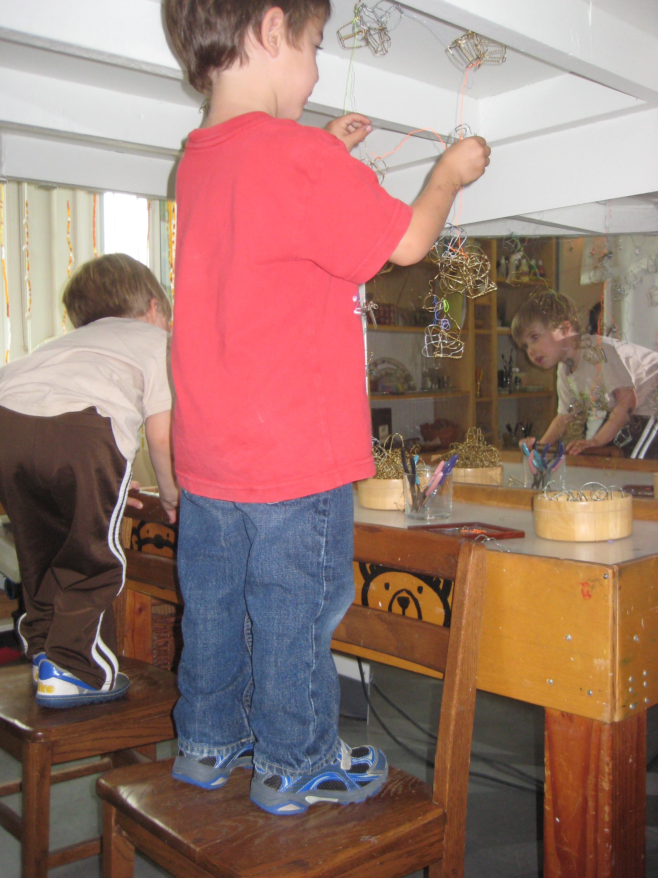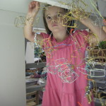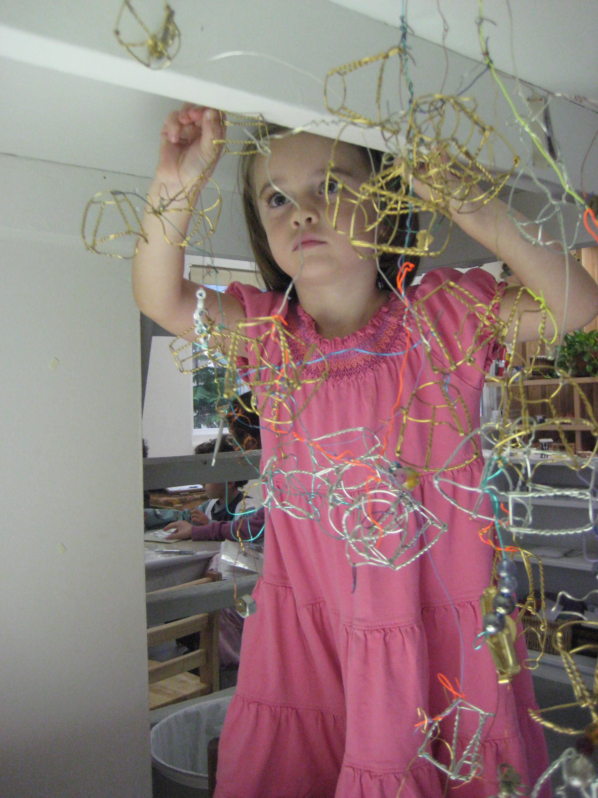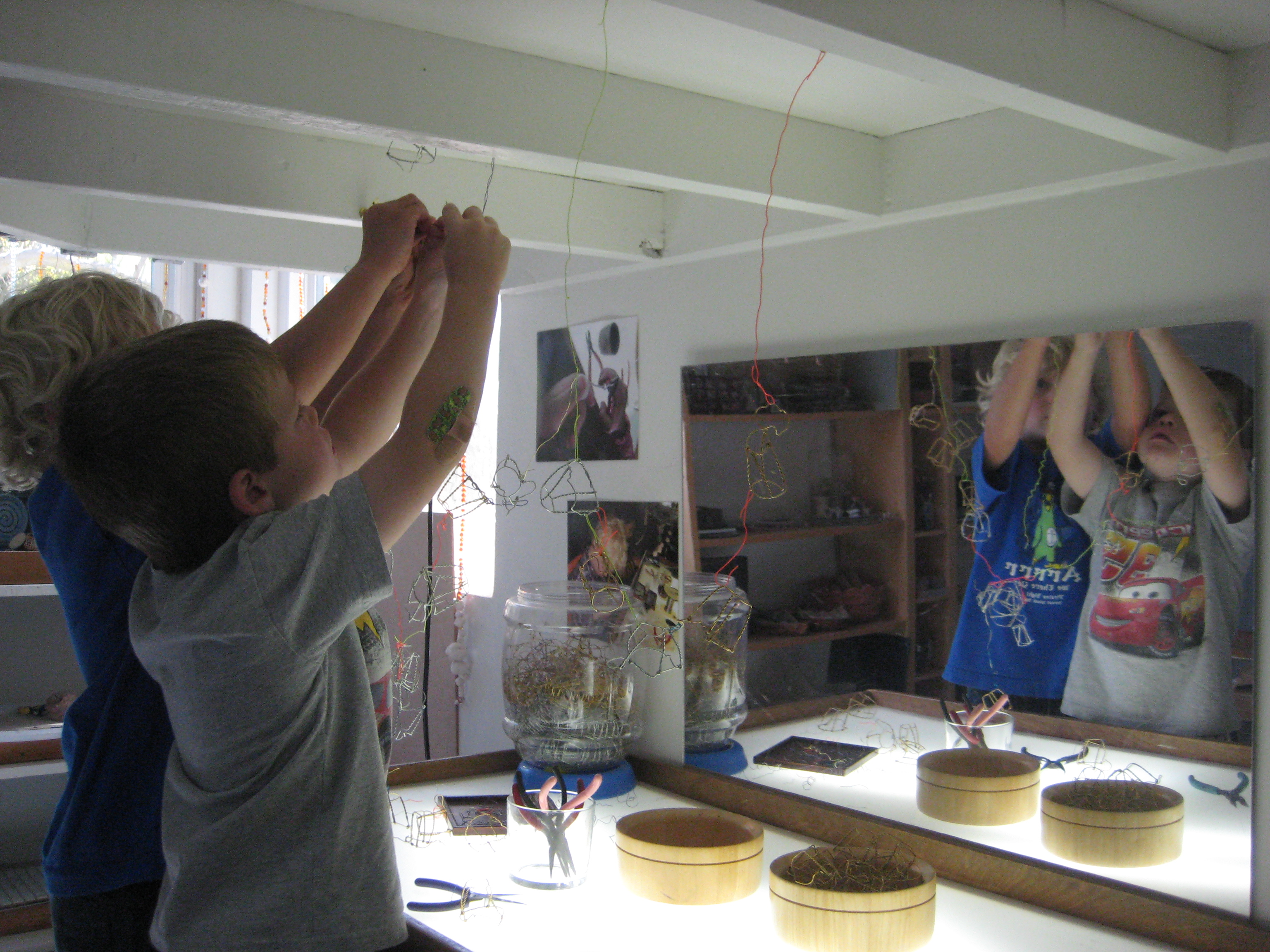 To my surprise, the children had found a way to connect wire to the ceiling under the loft. They had noticed two hooks that supported work from last year’s group of East Wingers and creatively put them to use. In consideration of our classroom intention, I wondered how this area and the work here could deepen the relationship of these two new friends.