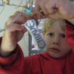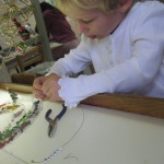 Over the next few days, Austin and Julian shared this work and all of the children wanted to add to it. As of now we have had to add a few more hooks to widen this growing piece of work. The children have been adding their names in beads to remind each other that as a group each one of us have been a part of this collaboration.