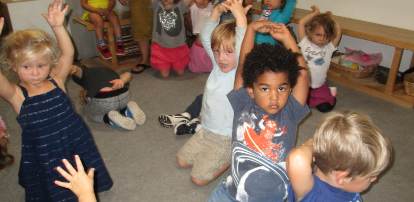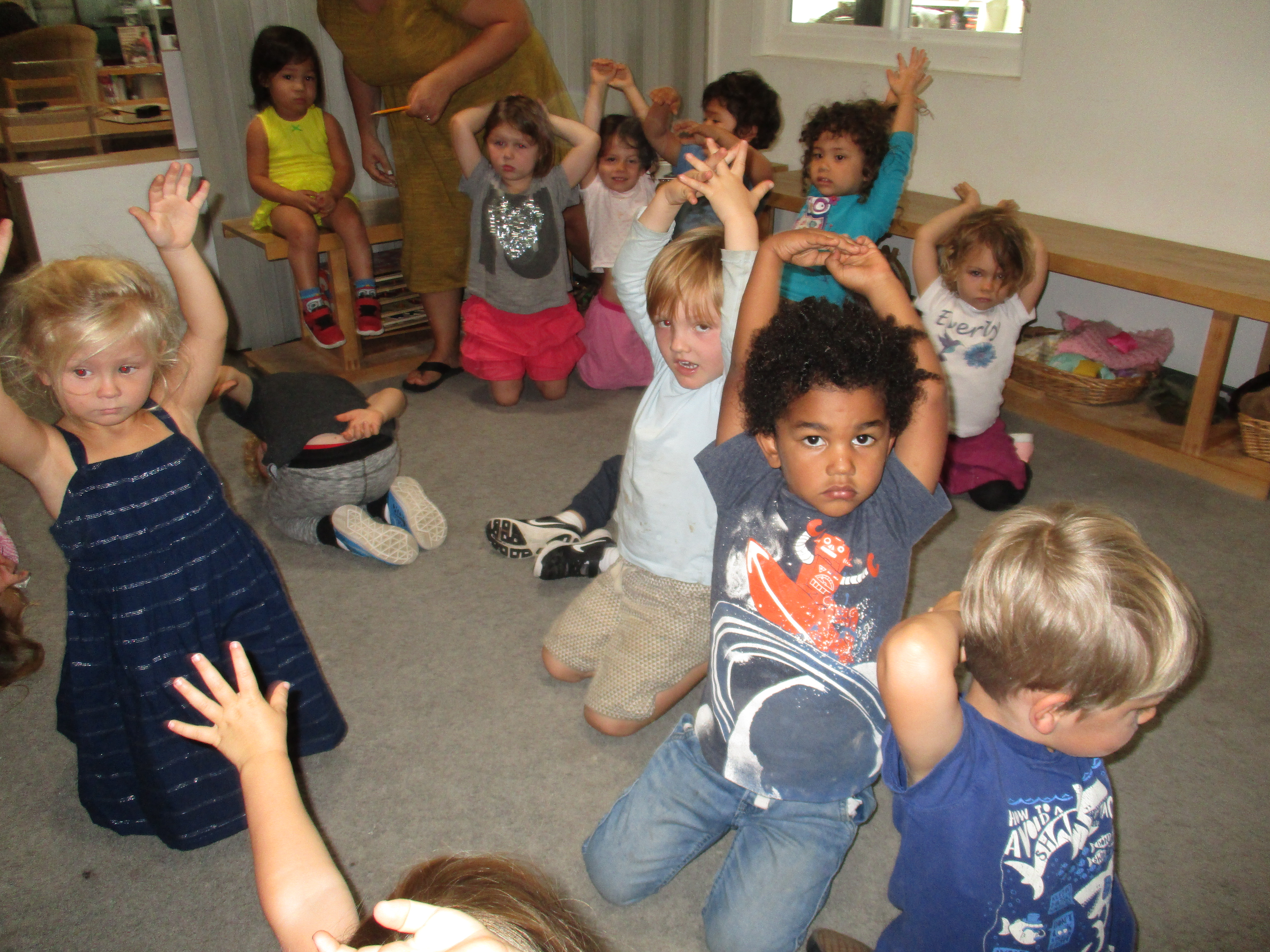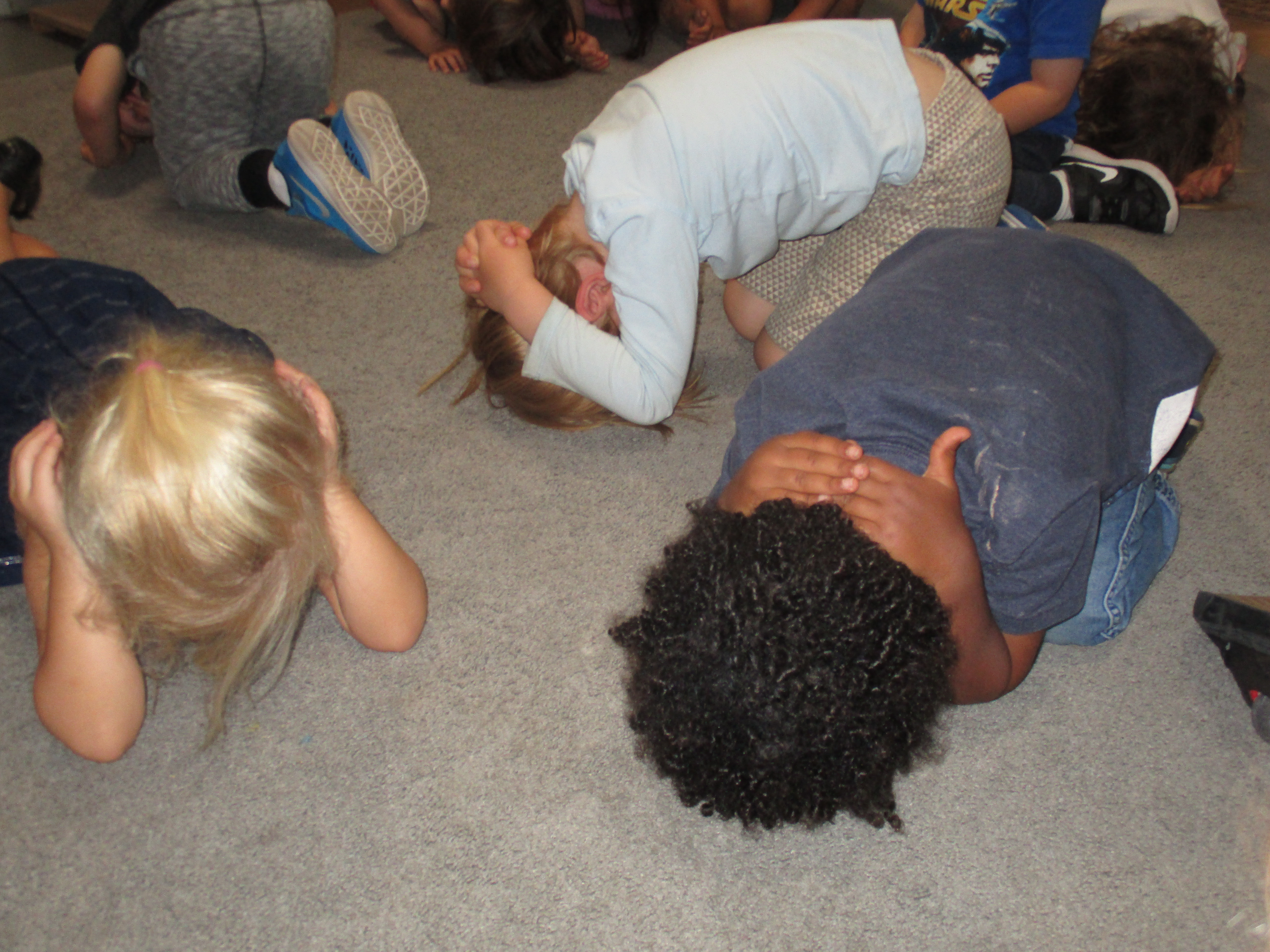 By introducing the duck and cover technique through a song, we create a game rather than associating the drill with fear.  Starting on our knees, we stretch our hands in the air.  Next, we lock our fingers and squeeze our neck.  Bending over, we curl up in a ball and become sleeping grizzly bears.  The song lasts the average length of an earthquake and then we all get to growl! At the end, we usually hear, “Again!”  Eventually we will add a key word, “Drop”, to be the signal that says we are going to practice the pose.