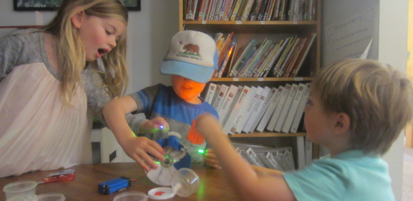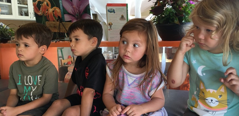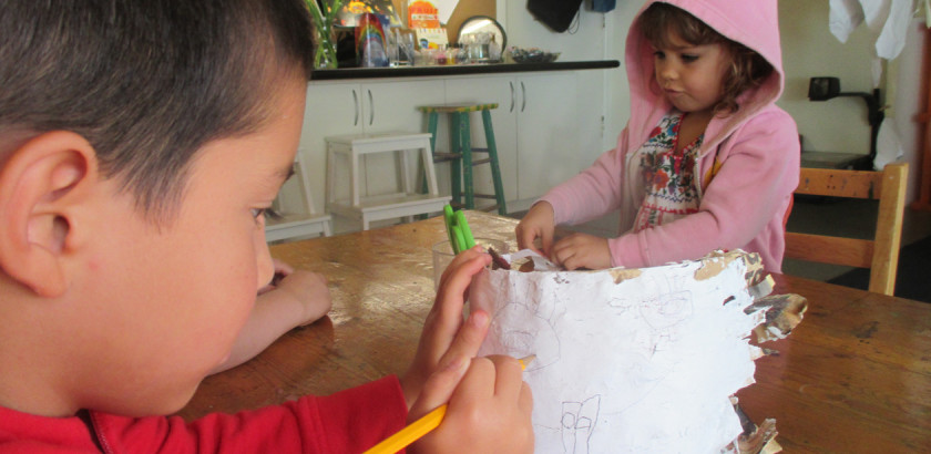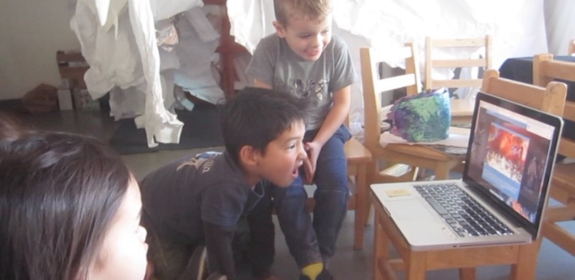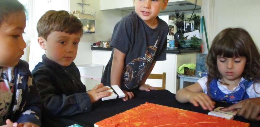 With all the interest in the textures of the things we see on neighborhood walks (things like the spiky cactus, and the rocky soil), Cindy offered explorations with acrylic mediums that offer different sensory representations within the paint. The West Wing children began with one collaborative, warm-toned painting and one cool-toned with additives made for…