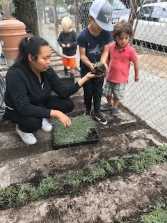 The Gardening Team worked hard over the weekend to update our community garden. They replaced dirt and broke and hauled away concrete to create a living pathway between the front and back play areas. Today, the children pitched in by planting the Diamondia between concrete slits so that it grows over them making a green…