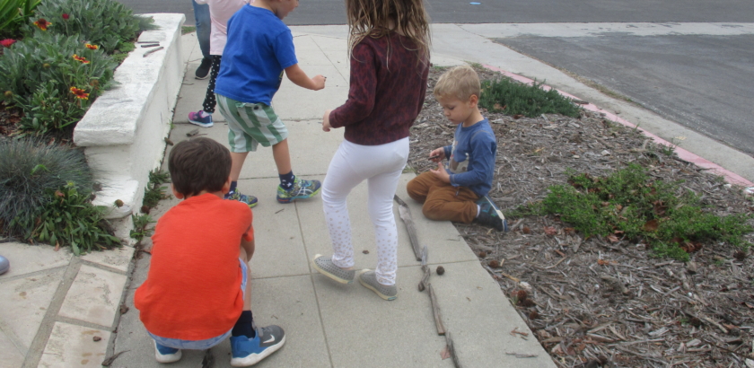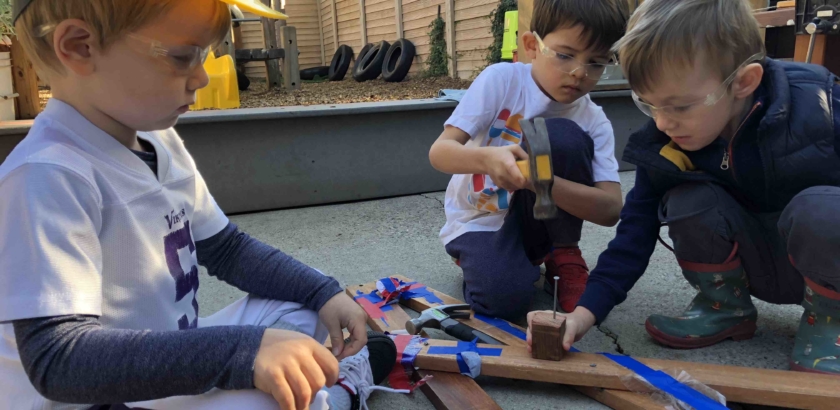 While working at woodworking, the children chose to work together on a machine.   Lola: Agnes, so what does this machine do? Agnes: It shoots robots. Then the robots become shrimp that when people eat it, they feel love. Clem: Agnes, how about if people are allergic to shrimp? Agnes: Oh, it also shoots vegetables and…