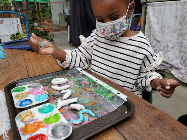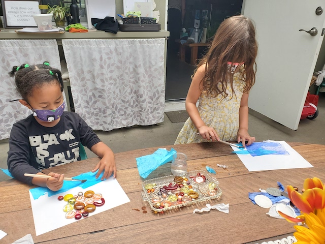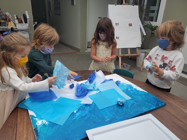 The children are deeply invested in the relationship between water and sky through the ocean investigation. This week they revisited their large ocean painting. Having previously worked on painting the water, this week’s lens was to consider possibilities for the sky. The group twisted, crumpled, folded, and flattened tissue papers in multiple shades of blue and laid them above the water on the surface of the canvas. The children’s thinking was in the changes and transformations the sky goes through in relationship with light.