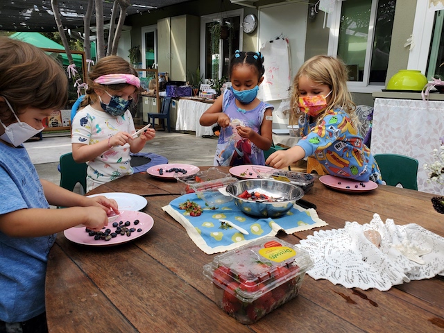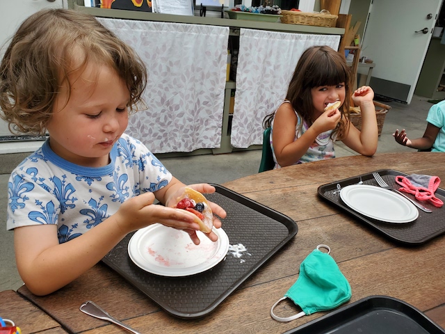 What better way to celebrate Pajama Day than with a stack of pancakes! A group worked to prepare a delicious bowl of berry compote to go along with our pancake snack. The team of chefs used their knife skills to chop strawberries and blueberries. Next, they drizzled a touch of vanilla with a tiny little bit of sugar for the makings of the yummiest pancake bite ever! The children mixed all the ingredients together and we put it in the fridge to chill for a bit. They were so proud to make a recipe for the whole group and couldn’t wait for everyone to get a taste.