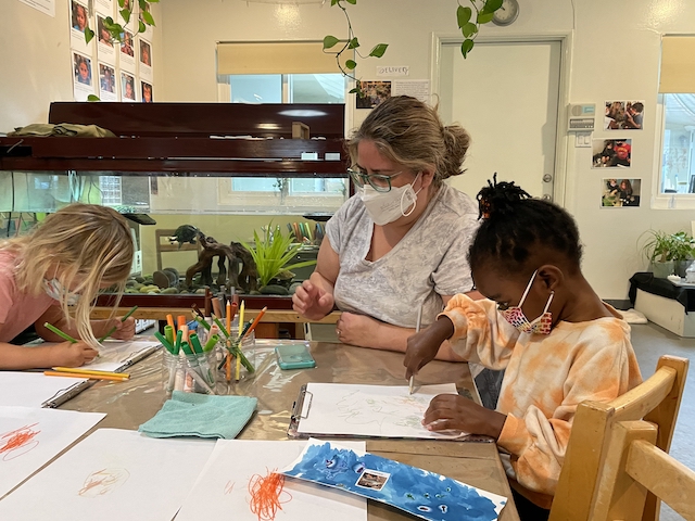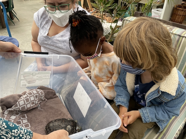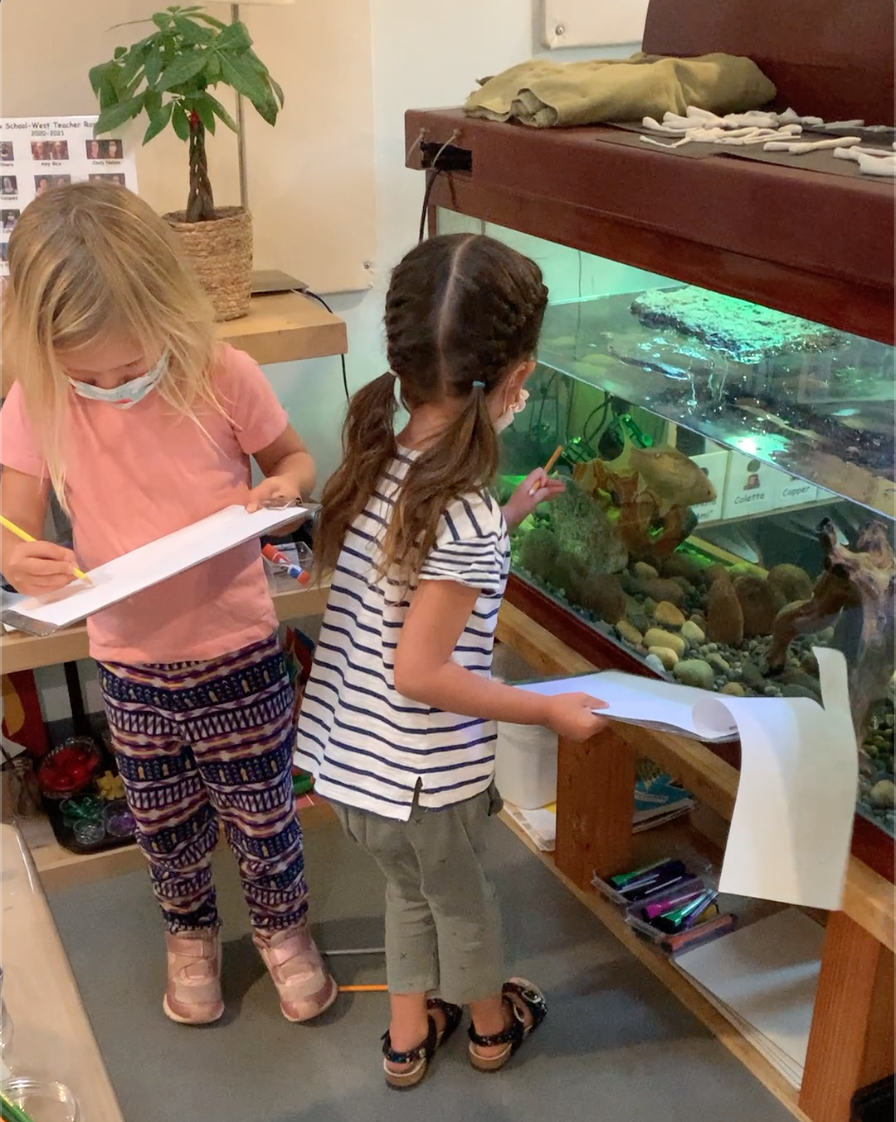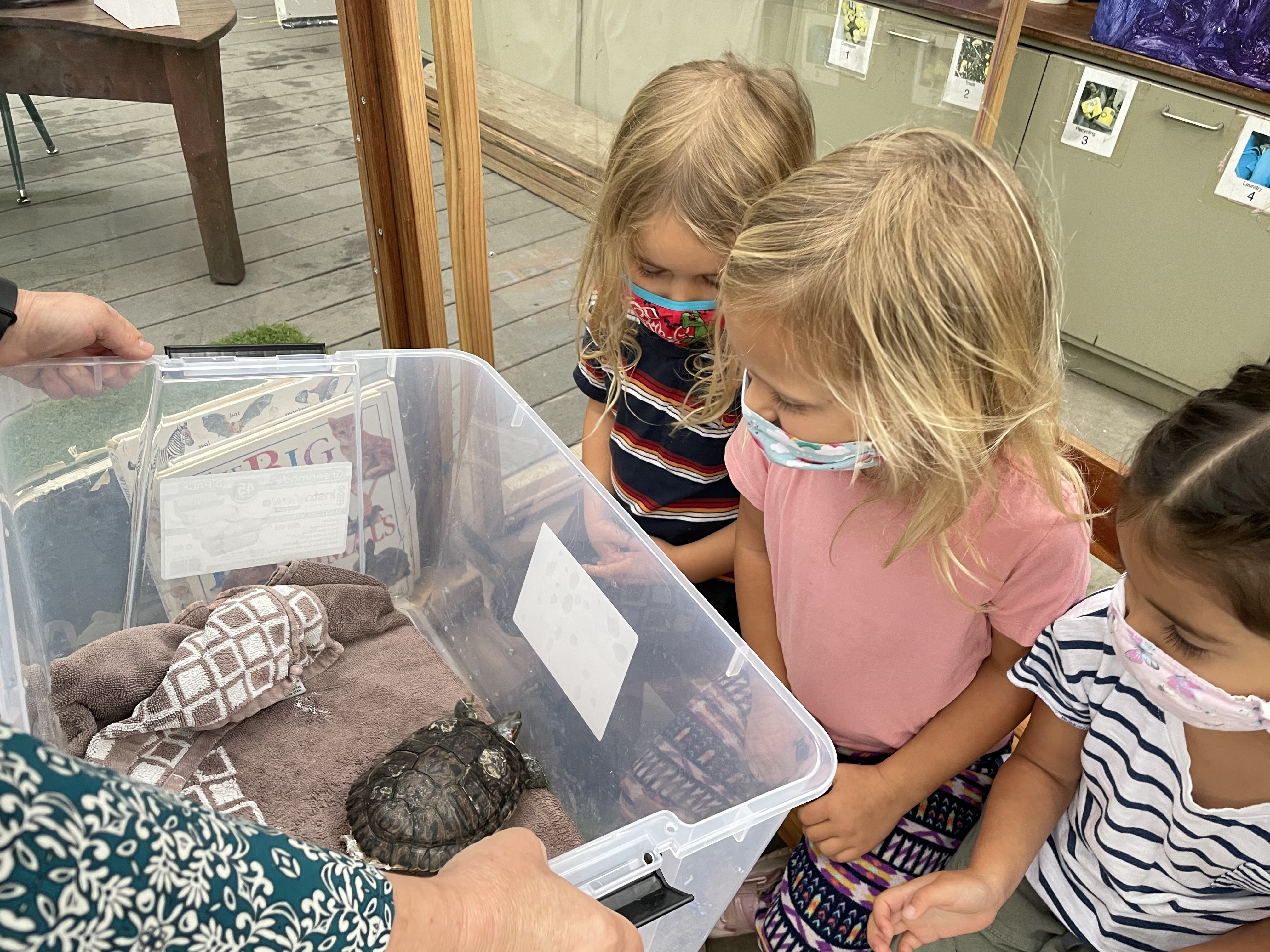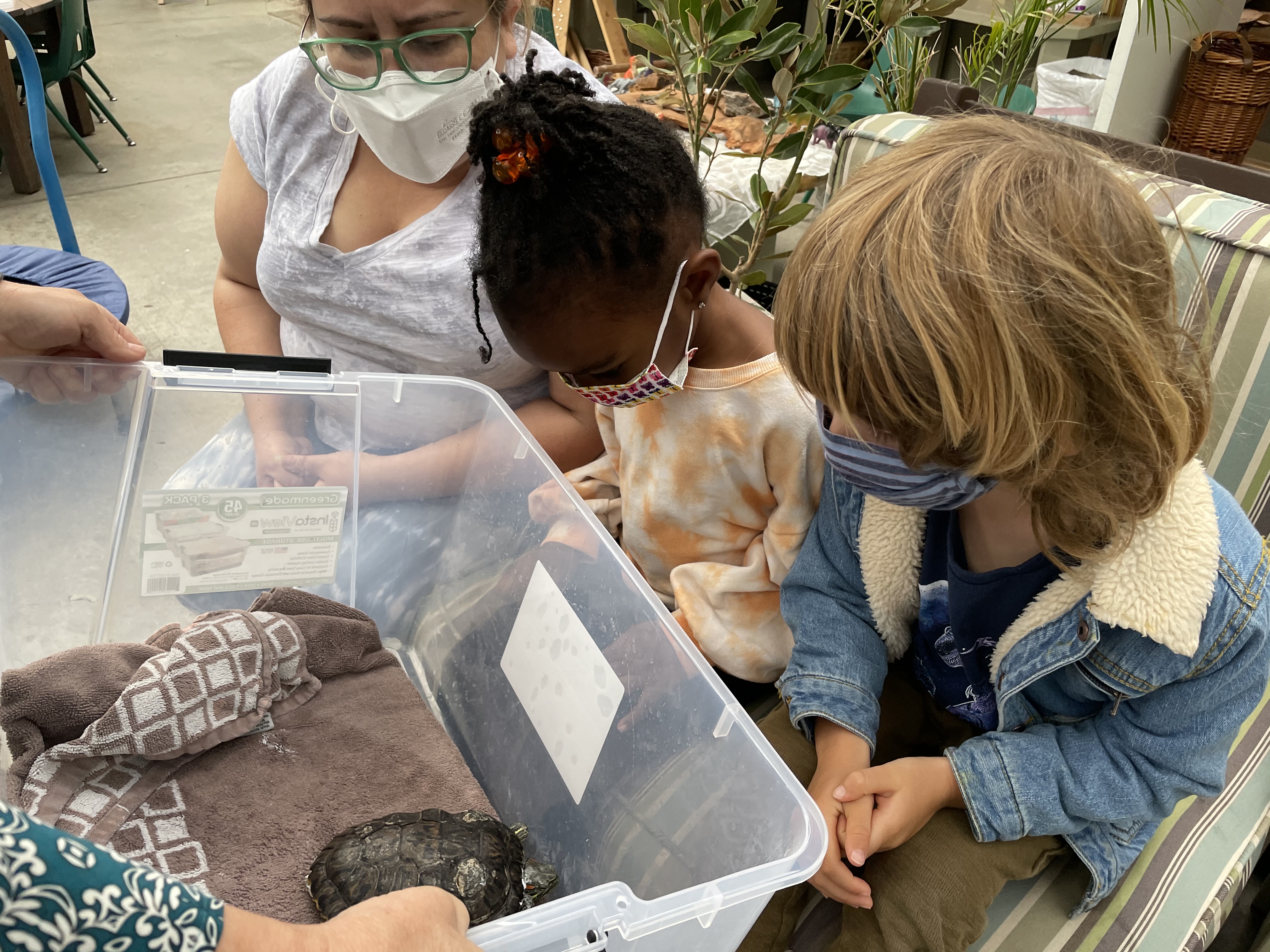 With Squirt and Snowball (the fish) being the sole vertebrates in the Cilantro classroom, the children have expressed concern for Snowball’s welfare. We are framing appointments for observing the turtle tank to listen to their ideas around Squirt and Snowball amongst the plants, rocks, and water in the tank.