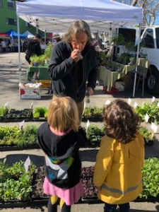 Roxanne returned to the Farmer’s Market with Michelle (Arrow’s mom, EW) and the children to connect our garden with the strawberries we had purchased there from farmer Pete. We planted them at NSW and returned to report how many flowers had bloomed. Pete told us it looked like we had 20 days to wait until strawberries appear. We also shopped for a bouquet to greet Roleen’s class this Saturday.