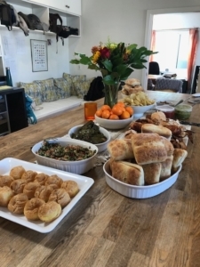 The Stevens (Harrison EW), Michies (Hayes EW), and the Karsentys (Diego WW) hosted a yummy Mediterranean Night with good spirits all around.