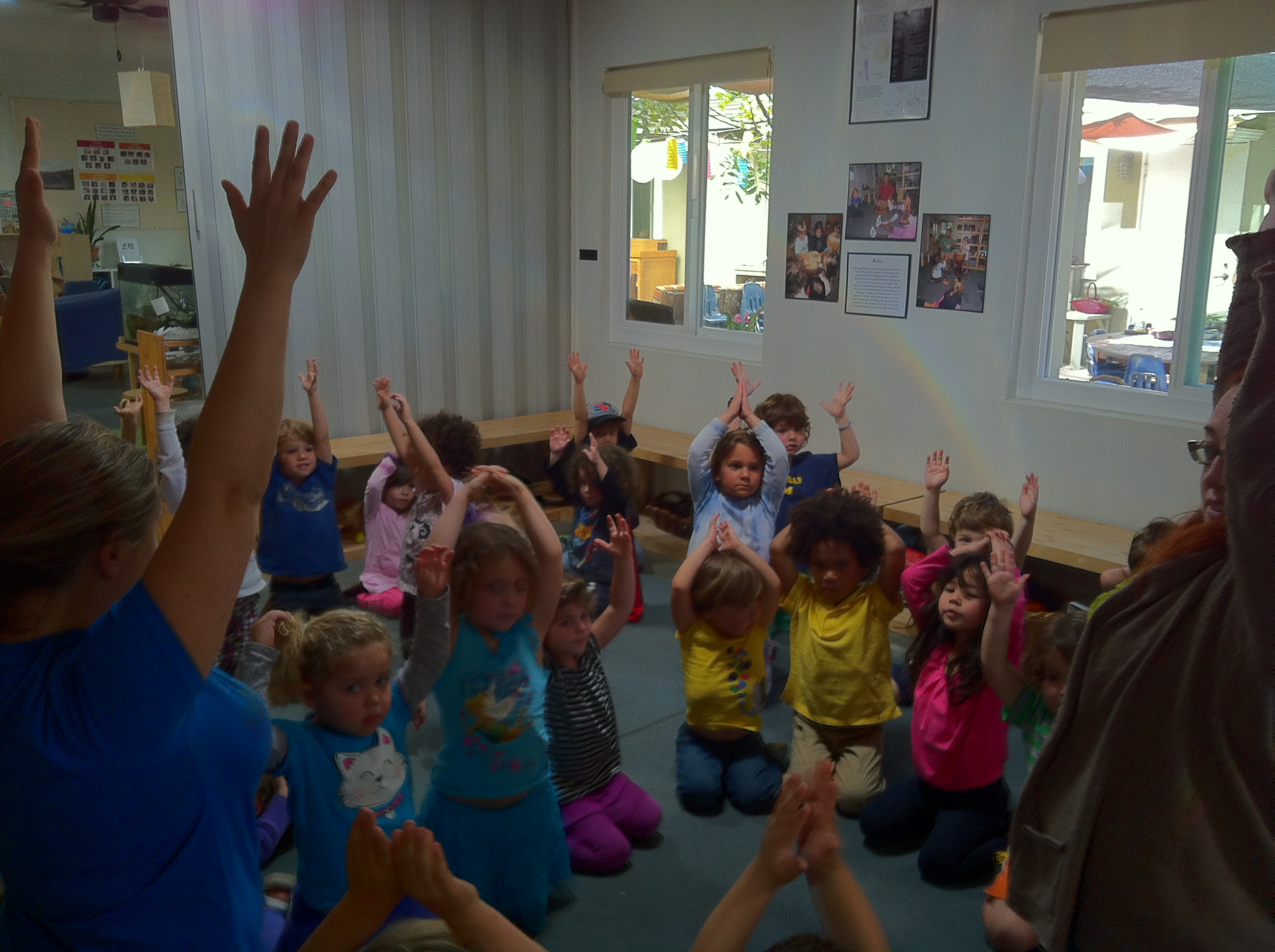 Then fold down over your thighs in ‘child’s pose’ while protecting the back of your neck. While there, we will sing one song then listen for the teachers direction.