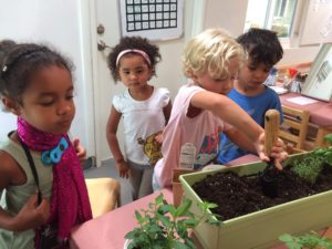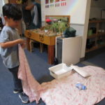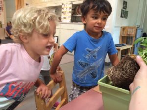 The children in the East Wing have developed a relationship to gardening from the work they’ve done together in the Front Yard. Our classroom has become another space we continue to deepen this connection with nature. Along with supporting teachers with preparing nap mats, refreshing our cups by the water dispenser, and writing “thank you” notes for families who bring the snack, watering classroom plants is a Community Job.