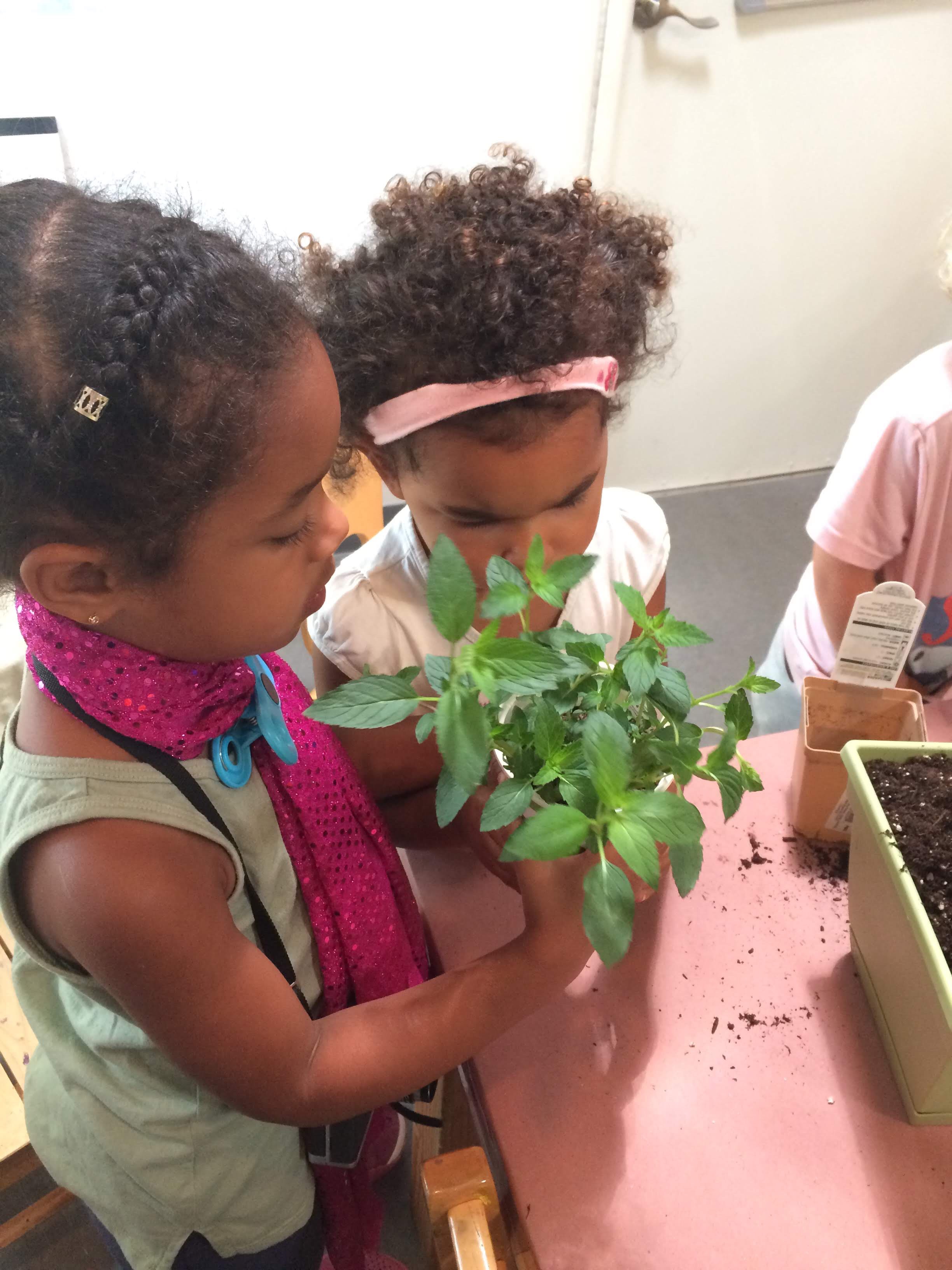 Naomi and Avey each pick a leaf from the peppermint plant. Enjoying the taste, each reaches for a second leaf.