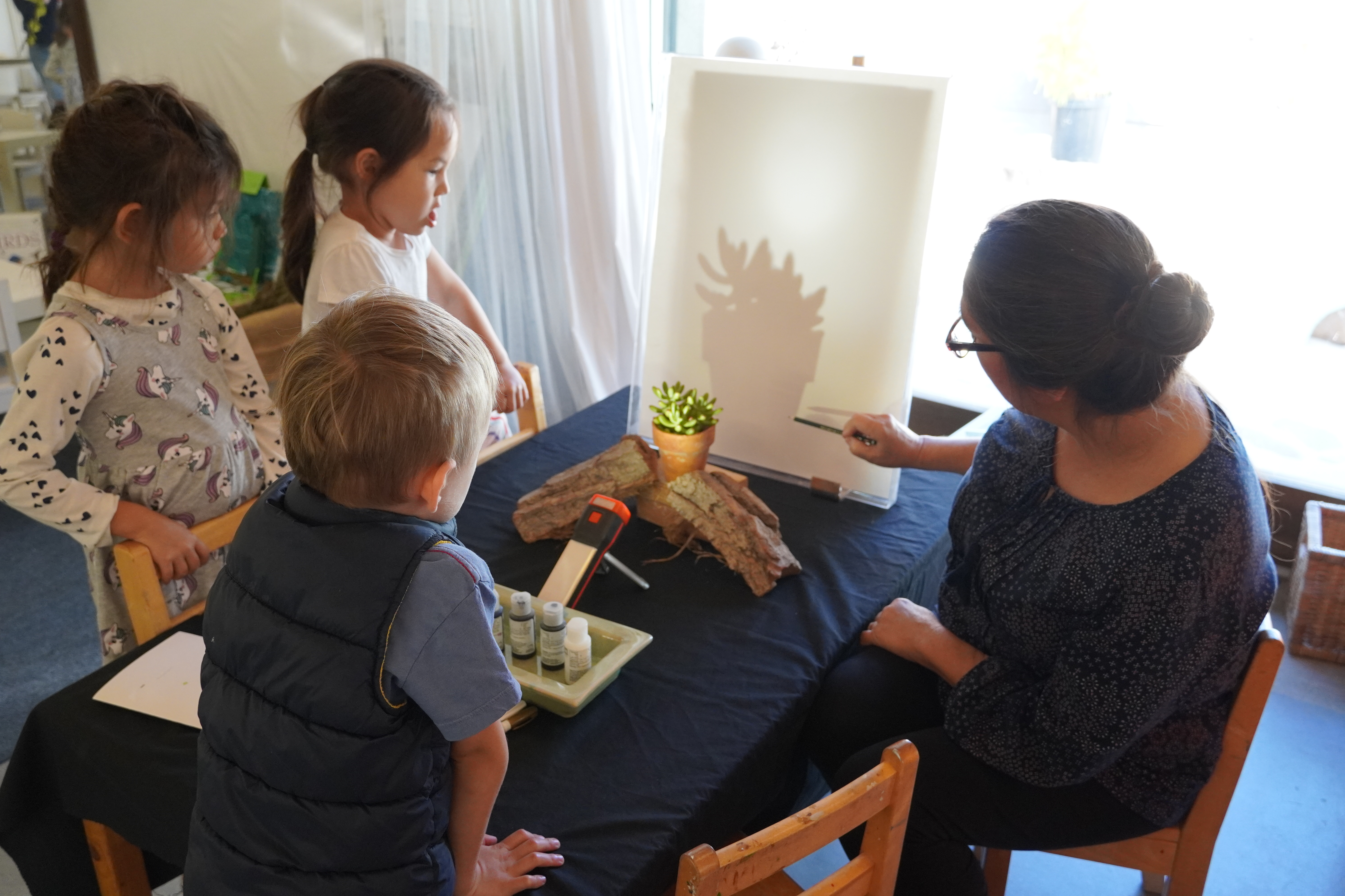 Cactus Land Theater has been building on last year’s interest in playing with shadows, where children used movement for demonstrating expression and created games using their shadows and silhouettes. The children have been exploring this new space and making connections in multiple ways: tracing, using the overhead projector, collaboration on creating “plays” and playing characters, using their shadows to interact, dressing up, and using dance as a physical expression of feelings or ideas. Right now the teachers are listening and observing these interactions to determine deeper interests and how to support them, whether with new materials, technology, or friends.