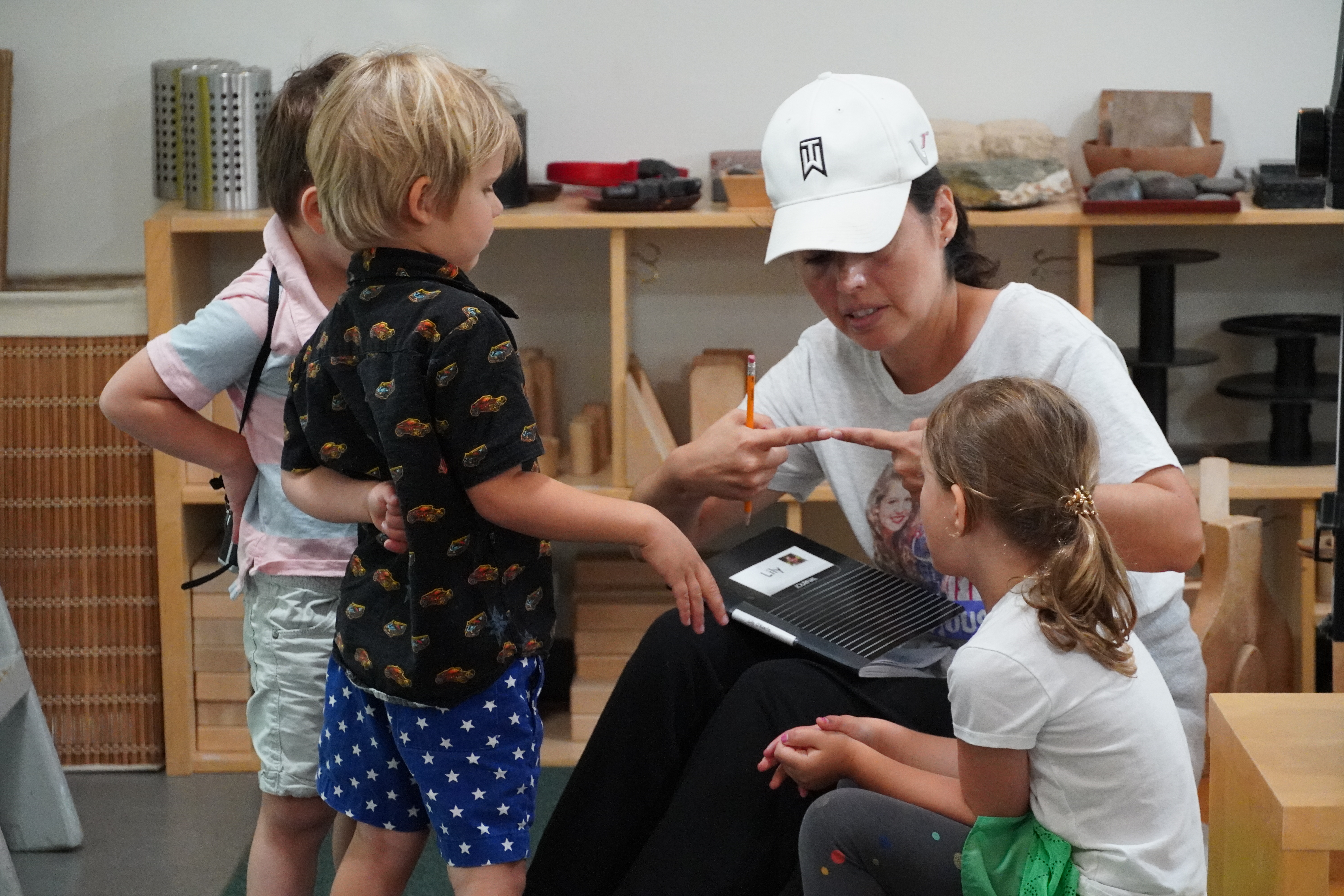 The computer and large monitor by the front door have been used to display a shared Word document that allows children to explore letters and word making. It is also available for children that want another option of “signing-in” in the morning time. The monitor will occasionally show a slideshow of the children themselves, making connections with each other and the materials. It’s another tool for Reflection and makes visible the concept of their Invisible Strings connecting the community.