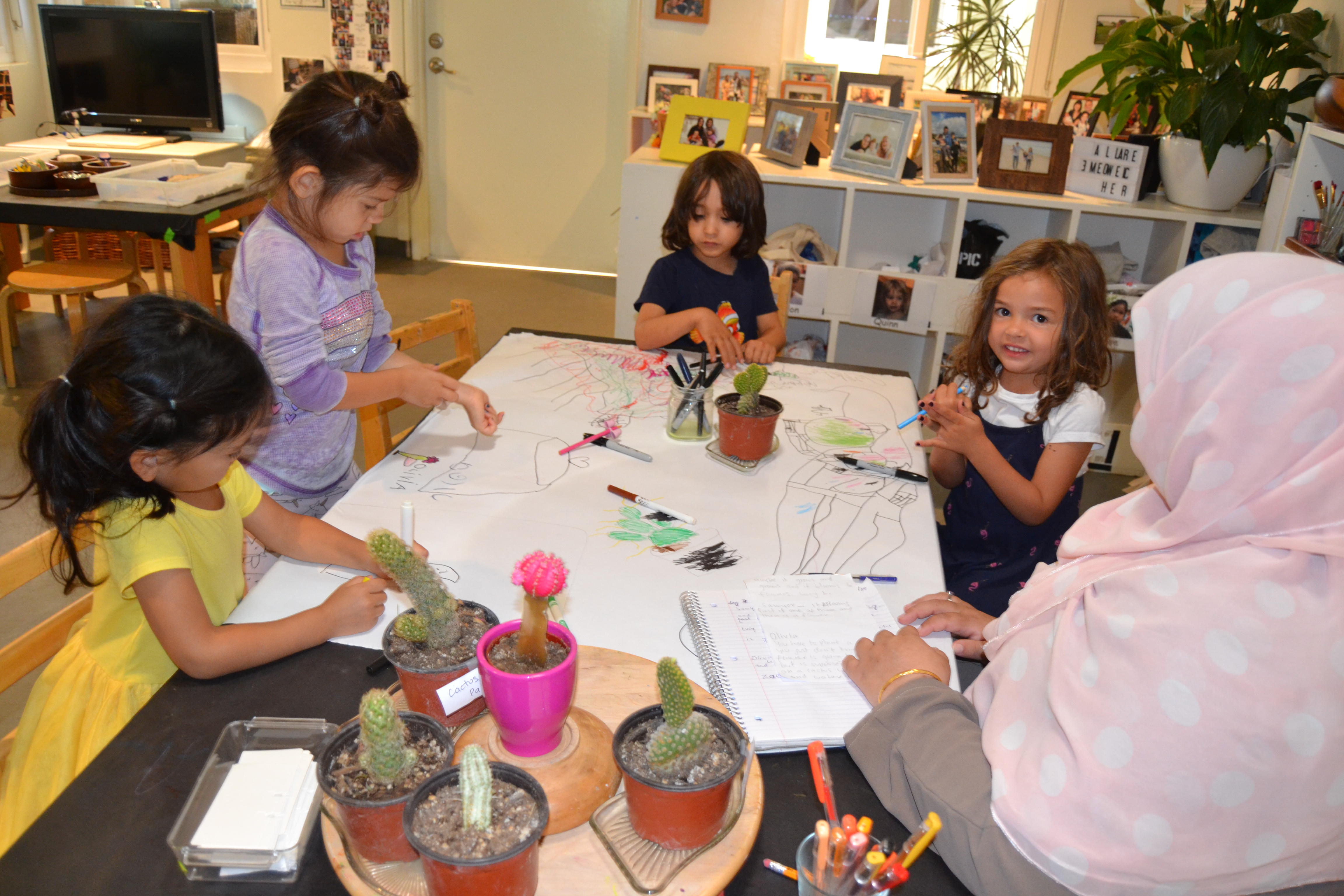 Cactus Land Theater has been building on last year’s interest in playing with shadows, where children used movement for demonstrating expression and created games using their shadows and silhouettes. The children have been exploring this new space and making connections in multiple ways: tracing, using the overhead projector, collaboration on creating “plays” and playing characters, using their shadows to interact, dressing up, and using dance as a physical expression of feelings or ideas. Right now the teachers are listening and observing these interactions to determine deeper interests and how to support them, whether with new materials, technology, or friends.
