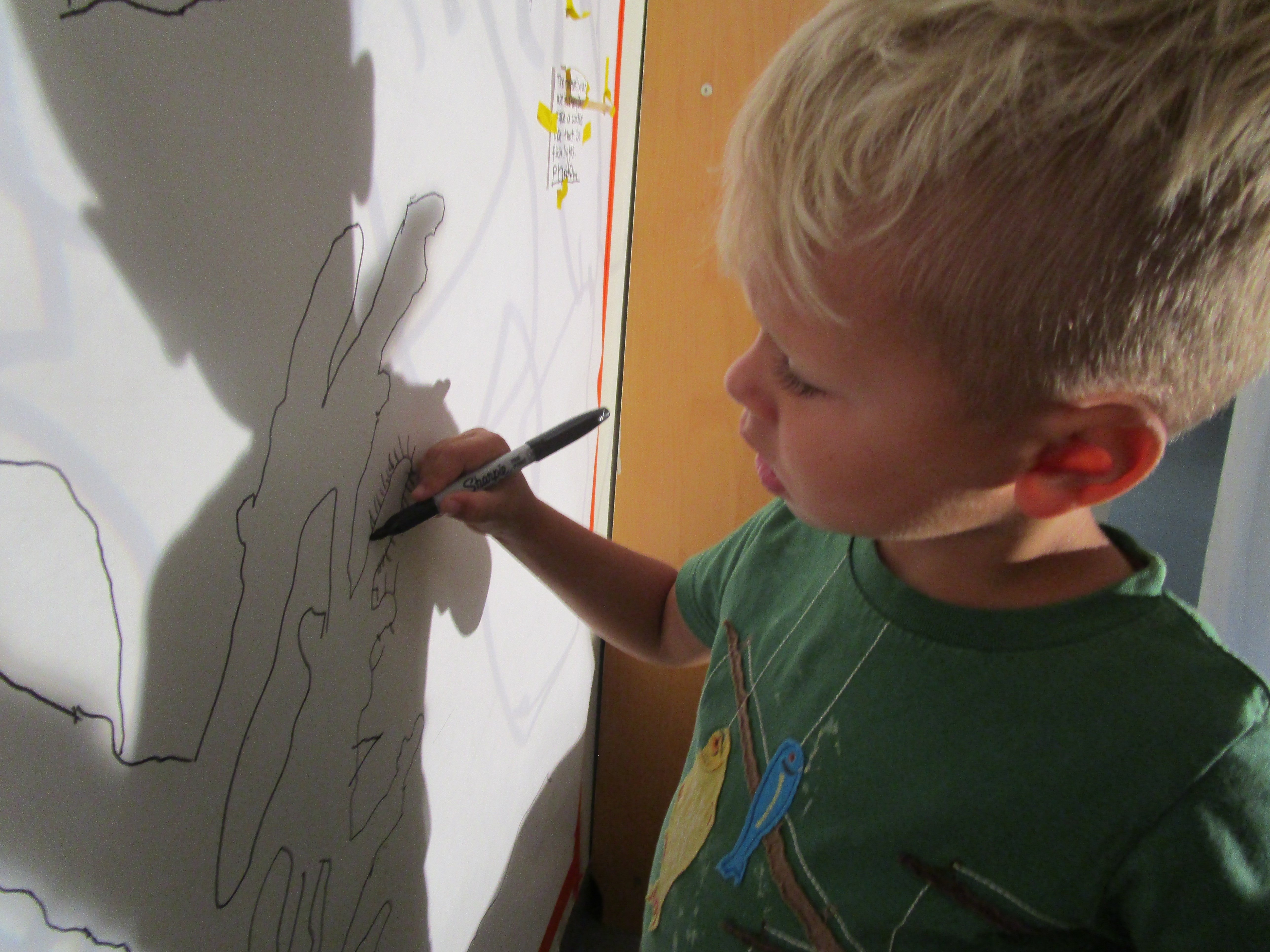 Cactus Land Theater has been building on last year’s interest in playing with shadows, where children used movement for demonstrating expression and created games using their shadows and silhouettes. The children have been exploring this new space and making connections in multiple ways: tracing, using the overhead projector, collaboration on creating “plays” and playing characters, using their shadows to interact, dressing up, and using dance as a physical expression of feelings or ideas. Right now the teachers are listening and observing these interactions to determine deeper interests and how to support them, whether with new materials, technology, or friends.