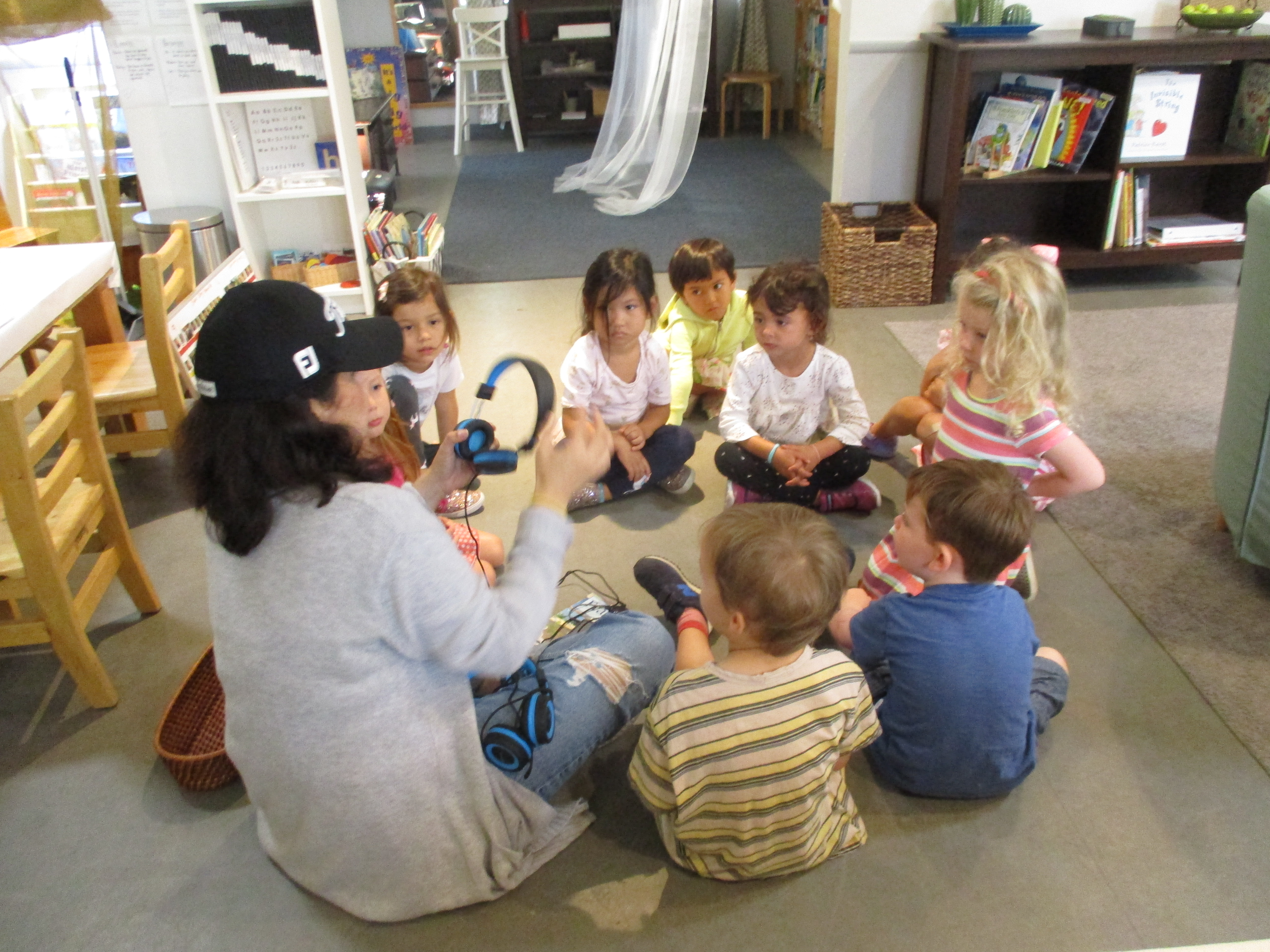In the Living Room, children can choose a favorite audio book and listen with 2 others using the splicer and iPod. They need to coordinate and support each other turning the pages and keeping pace with the story by listening and following prompts. There are quite a few steps to set up and put away this activity, so it provides a practice of responsibility for the classroom as well as cooperation.