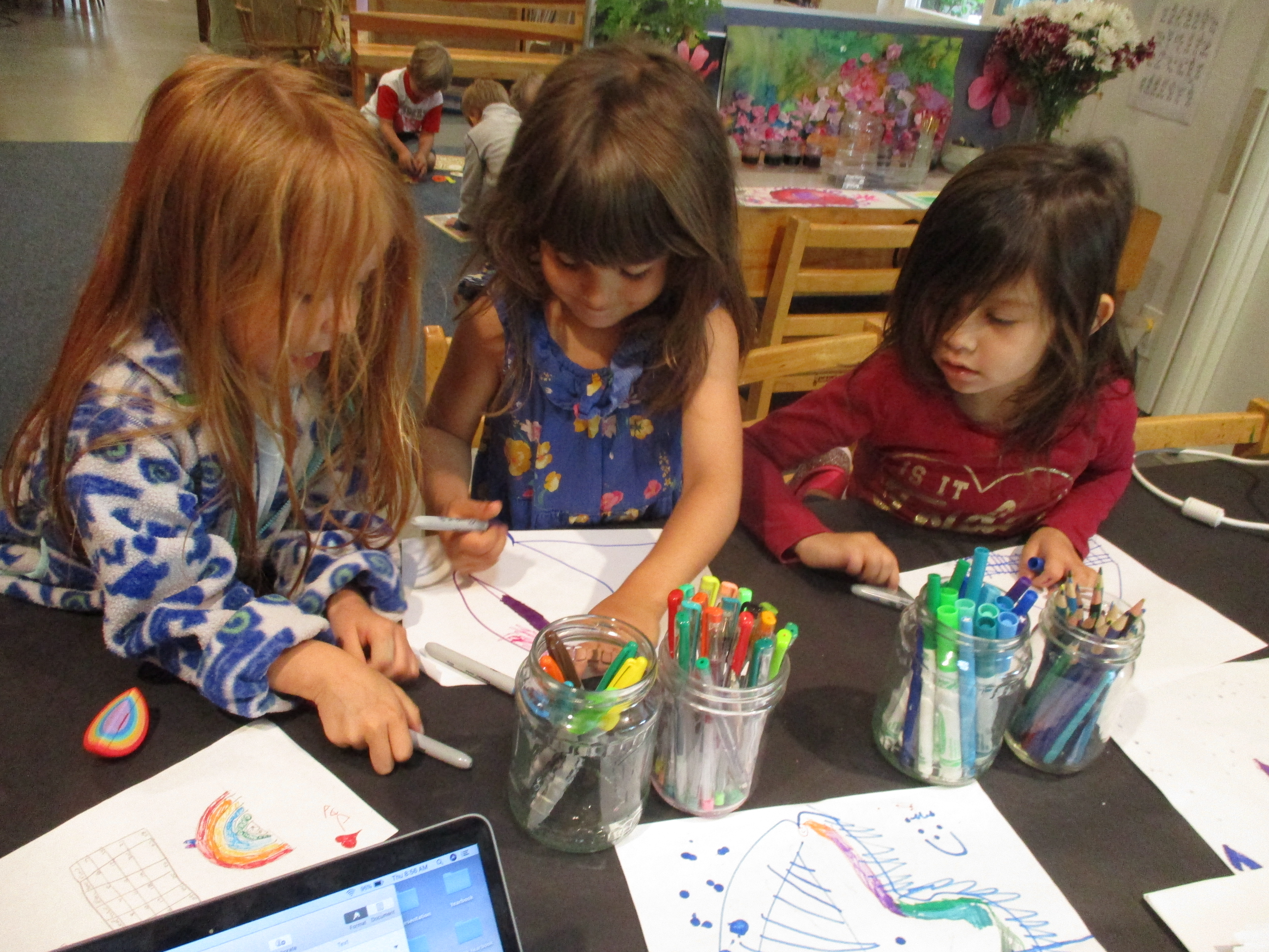 The computer and large monitor by the front door have been used to display a shared Word document that allows children to explore letters and word making. It is also available for children that want another option of “signing-in” in the morning time. The monitor will occasionally show a slideshow of the children themselves, making connections with each other and the materials. It’s another tool for Reflection and makes visible the concept of their Invisible Strings connecting the community.