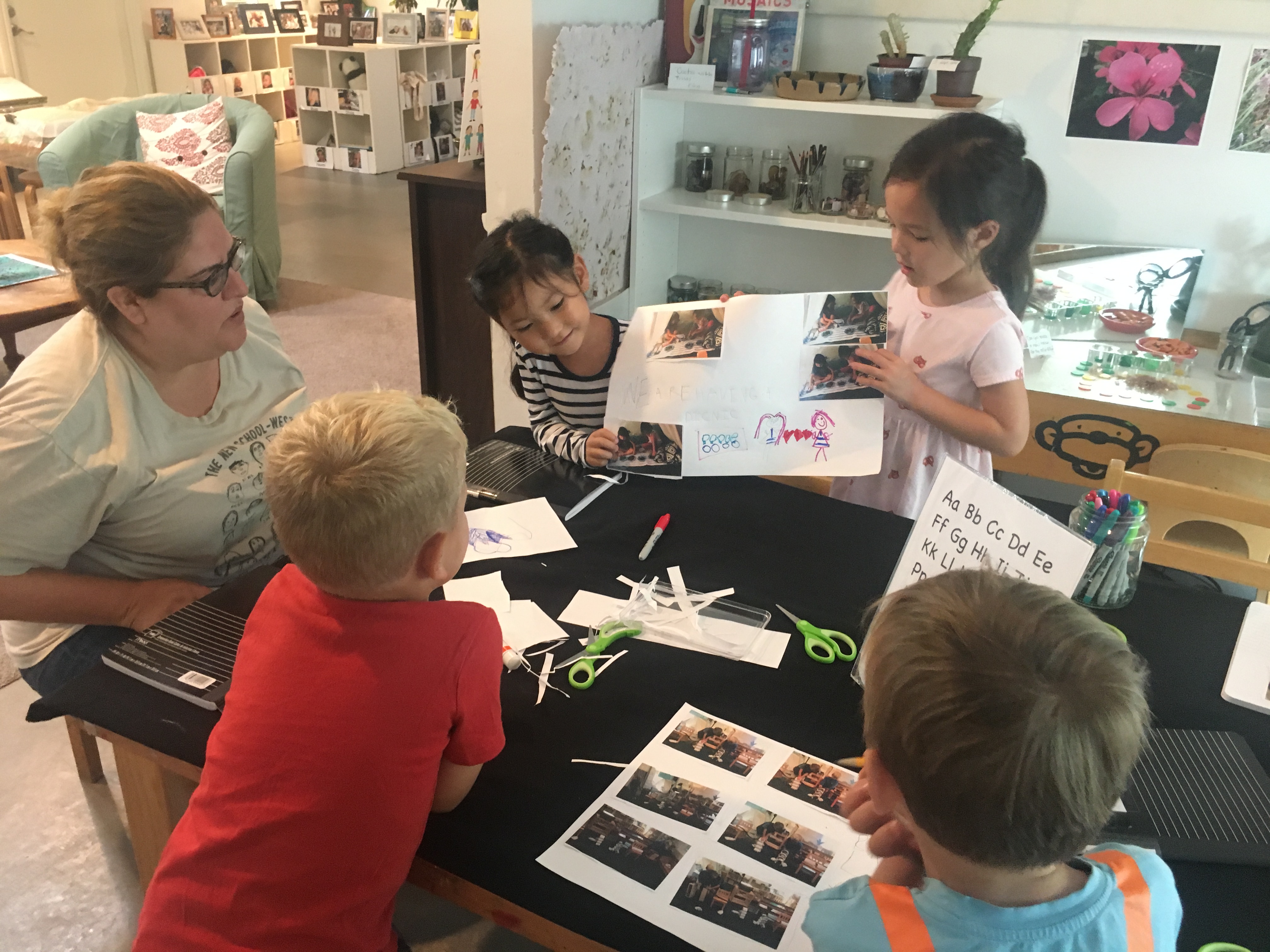 At drop off, the Communication Center has been a place for children and parents to write notes to each other in support of transition. When they were in the West Wing, they used their journals to label feelings in certain moments or to document feelings that they couldn’t express to others at the time. The Communication Center is still a place to use these familiar tools and materials but has incorporated some new ideas to support this group’s love of original storytelling and acting out stories. This originality is dependent on their own skill and we ask that you DO NOT draw images for children but ask them how they would represent it. The journals are a place to keep the stories that live in their minds, perhaps to be shared later at Reflection meetings or acted out in the Cactus Land Theater. This new journal work is supporting literacy via fun storytelling.