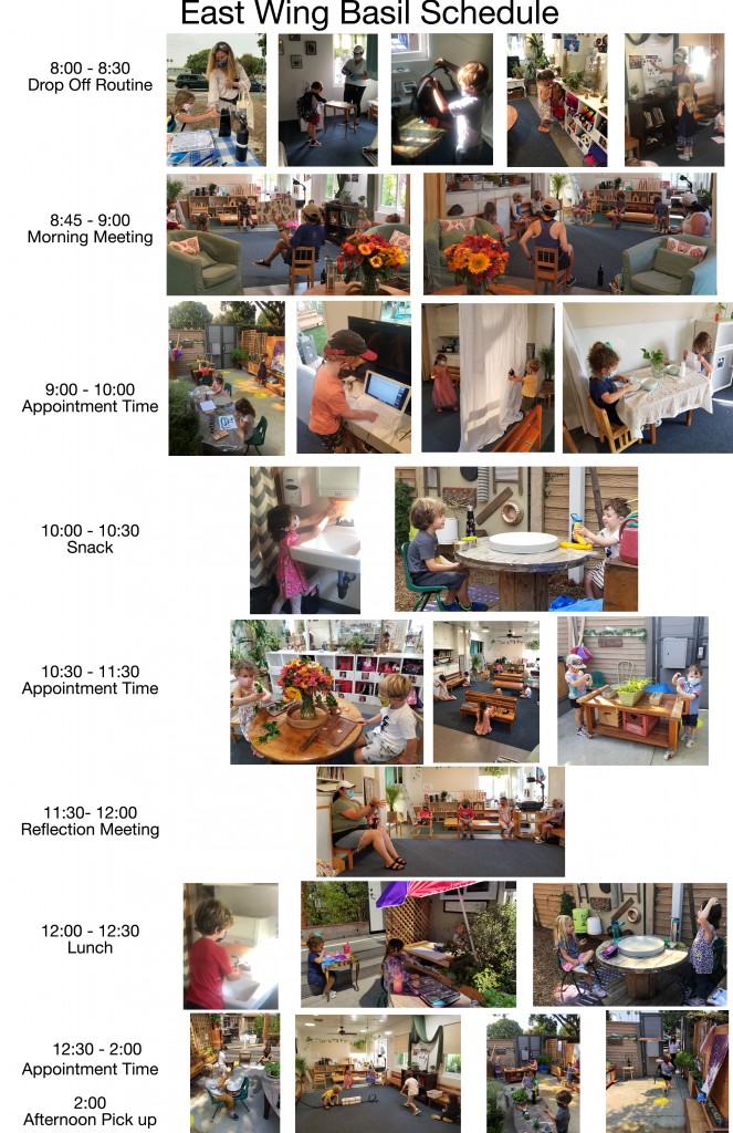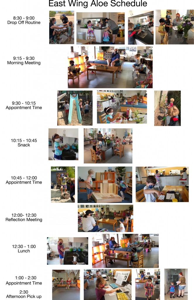 A schedule gives us safety in routine, a reference point to re-center ourselves, and a tool we can use to feel empowered to know what is coming next. As we build routine in these first weeks with the children, we hope they gain a sense of security and predictability as the schedule becomes familiar. We also hope this will allow them to focus on being present in the moment. By sending home a copy of the schedule, the children can revisit it with you and share their new routine with its differences and similarities to the old one.