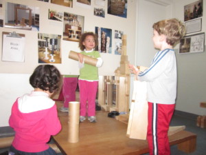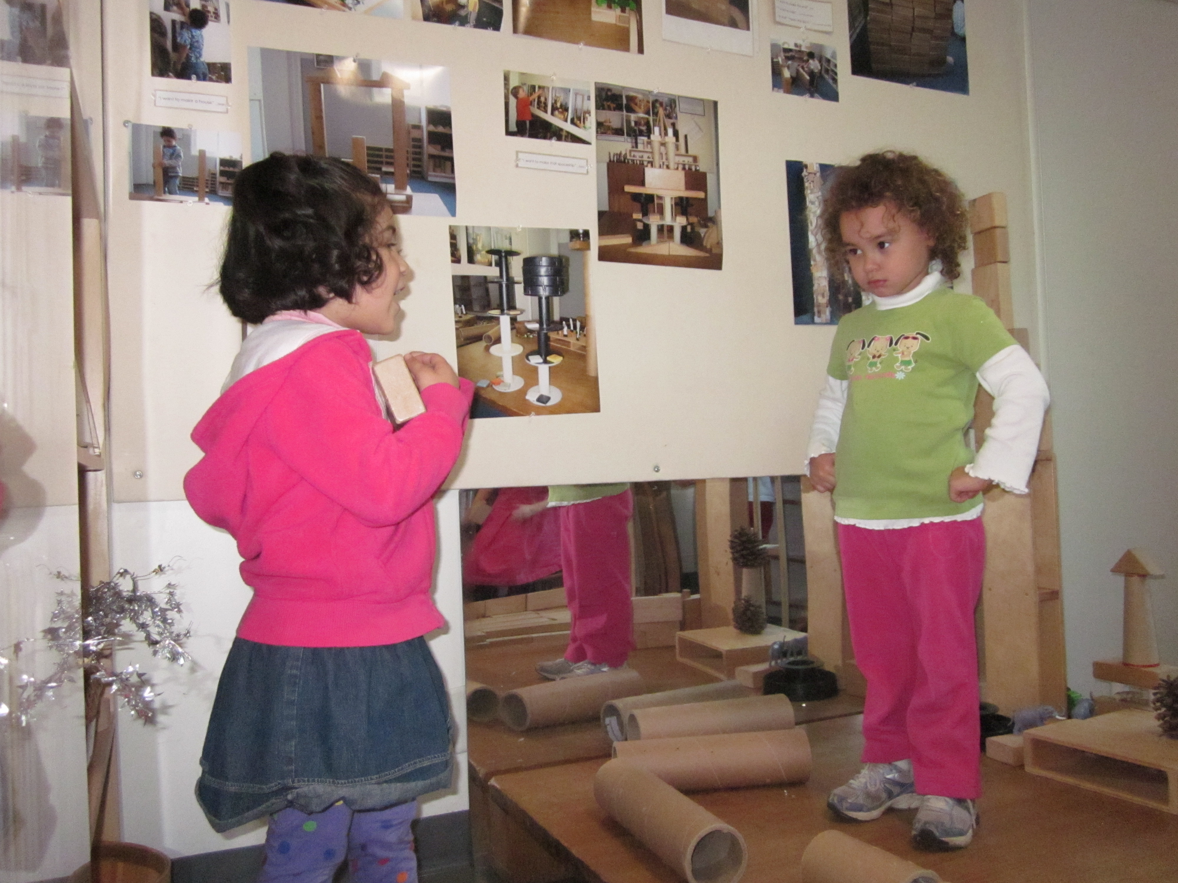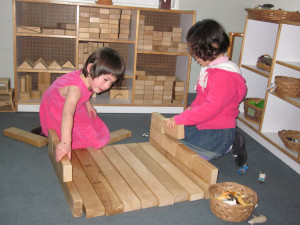 Carla and Raven were building in the block area, cooperating on their placement of blocks.