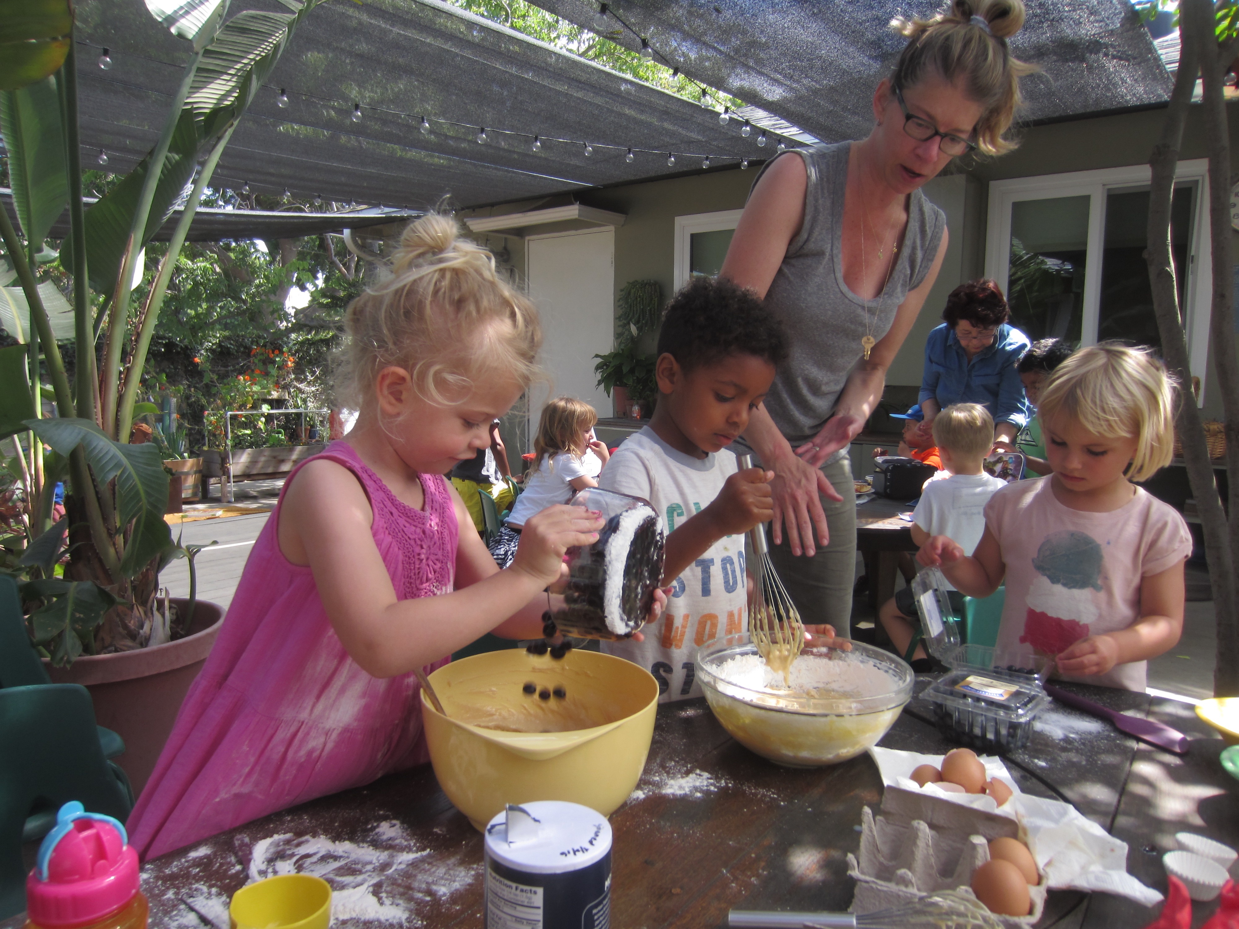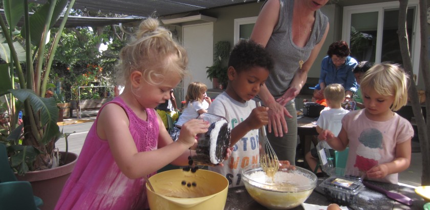 She thought that the morning offered more time to investigate the process – test the flavors, smell the ingredients and in this case, discover the difference between frozen and fresh blueberries when making muffins (frozen ones turn the batter blue!). On that morning, she stayed through lunch to serve the muffins afterwards. Olivia was so proud to have shared her mom and their baked goods. Olivia wanted to return again to give the afternoon group a chance. Today Liz repeated the experience in the afternoon.