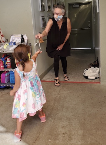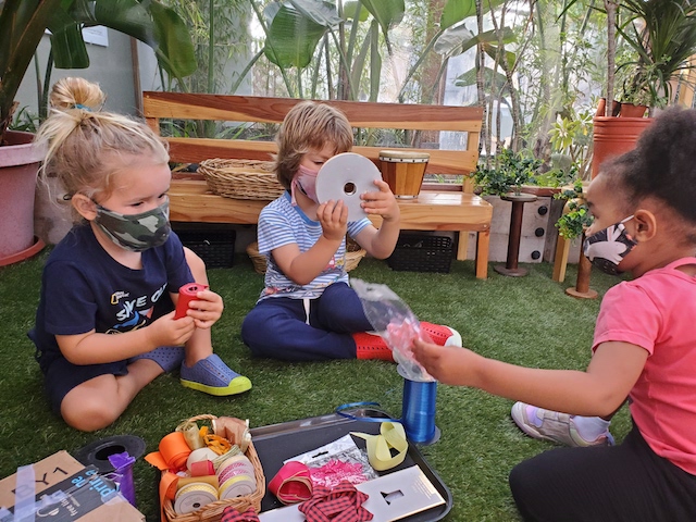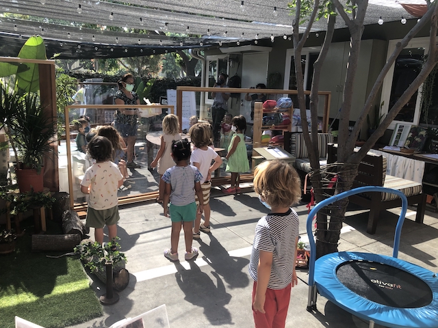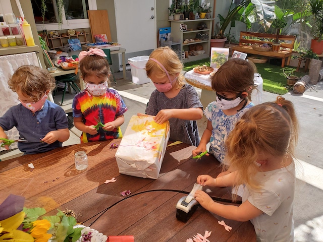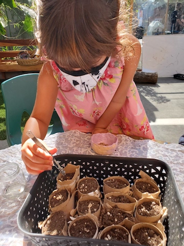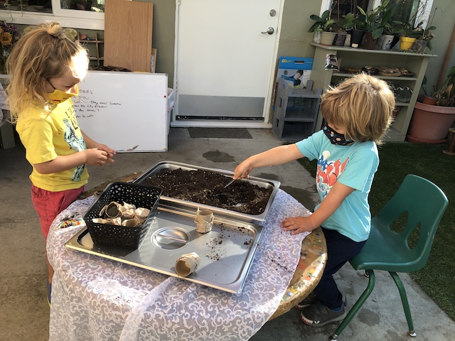 During our first playdates, the Cilantro children explored all the areas of the classroom and Middle Courtyard. One corner of the Middle Courtyard was set up with seeds, pods, leaves, petals and many natural materials to explore.  Copper spent some time grinding the cilantro seeds and wondered out loud, “How could we plant them?” The question was placed in the area for consideration with her new peers.