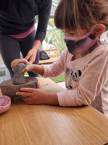 The children used the molcajete (pestle) to grind and explore the fragrances coming from the natural materials. Roleen was visiting and surprised the group with a tiny gift pouch filled with cilantro seeds. Attached was a note that read “From our garden to yours.” I took a moment to revisit the question from Copper and proposed we plant these seeds to see what might happen.