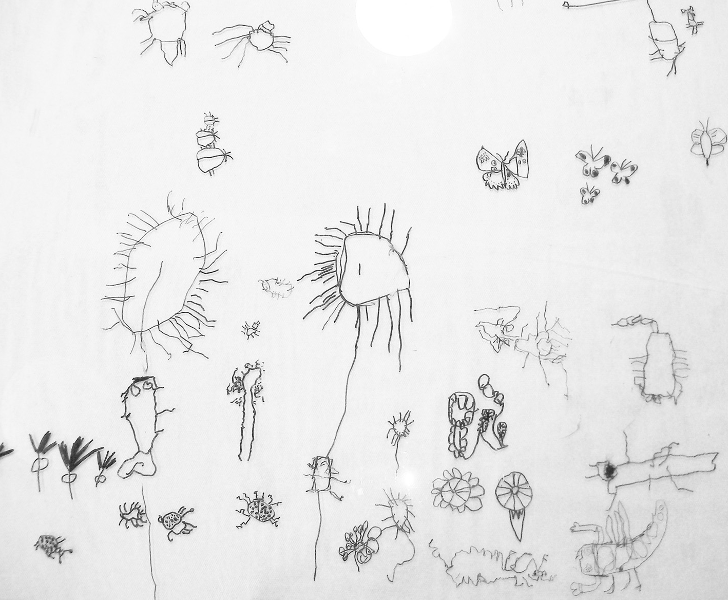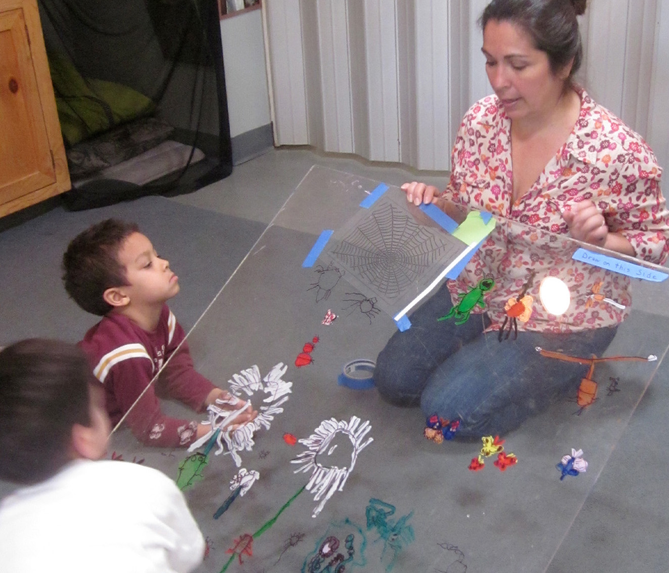 What began as a flower representation shifted to the beginning of an insect investigation. As the children transferred their drawings from a shower curtain to the more permanent Plexiglas panel, a conflict arose.