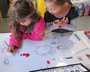 Micah and Julian drew their spiders and made plans to create a web on their next visit. Other children worked to add their insects. Knowing Micah and Julian’s plan, some friends still chose to draw their butterflies and ladybugs in close vicinity to the proposed web. When it was time to add the web those children were intentionally included in the meeting to negotiate its placement.
