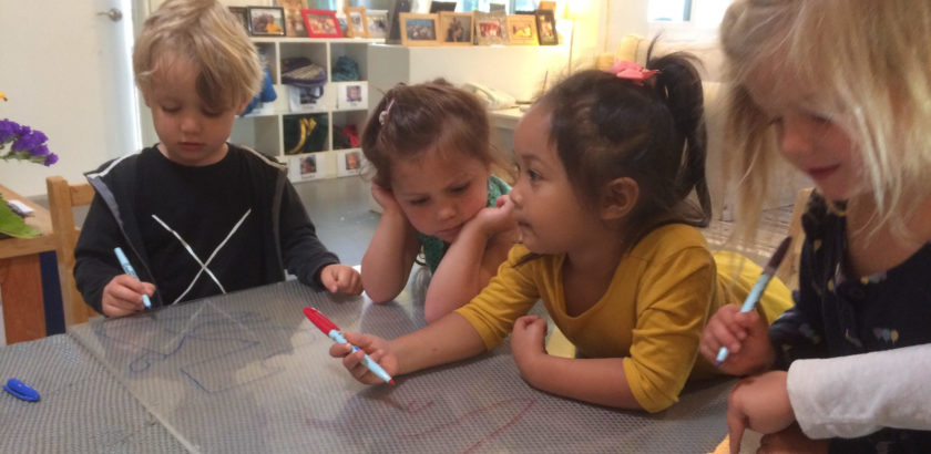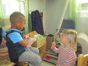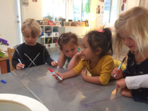 We meet in the Communication Center and read the story written by the other group of children the previous day. The story isn’t complete and as a group, we plan to add to the story and support the resolution of a conflict between the family and the wolf.