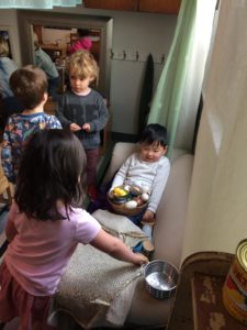 The children’s discussion and conclusion explored how the wolf might successfully make amends with the family. The group struggled with the permanence of Mama Pig being eaten and made the ultimate reversal or ‘do over’ for the wolf by resurrecting the mama pig. Then they put strategies in place to help the offending wolf stay on the straight and narrow by providing him with slimy bugs. As I listen and write their resolution, I’m touched by the children’s belief that regretful actions can always be undone, no matter how dire things seem, but I find myself wondering about the real-life challenge of repairing relationships and working through concepts of forgiveness in spite of regretful action. In wondering how to address the concept of forgiveness, Kristin suggested that Mama Pig’s unresolved feelings — “happy to be free but sad she was eaten” — might provide the necessary opening to examine how the children confront true forgiveness. I look forward to exploring these ideas further with the children.