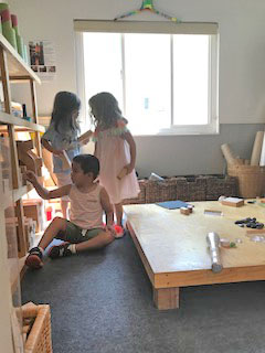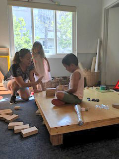 Anaya and Kai work together to stack the blocks back on the shelf.