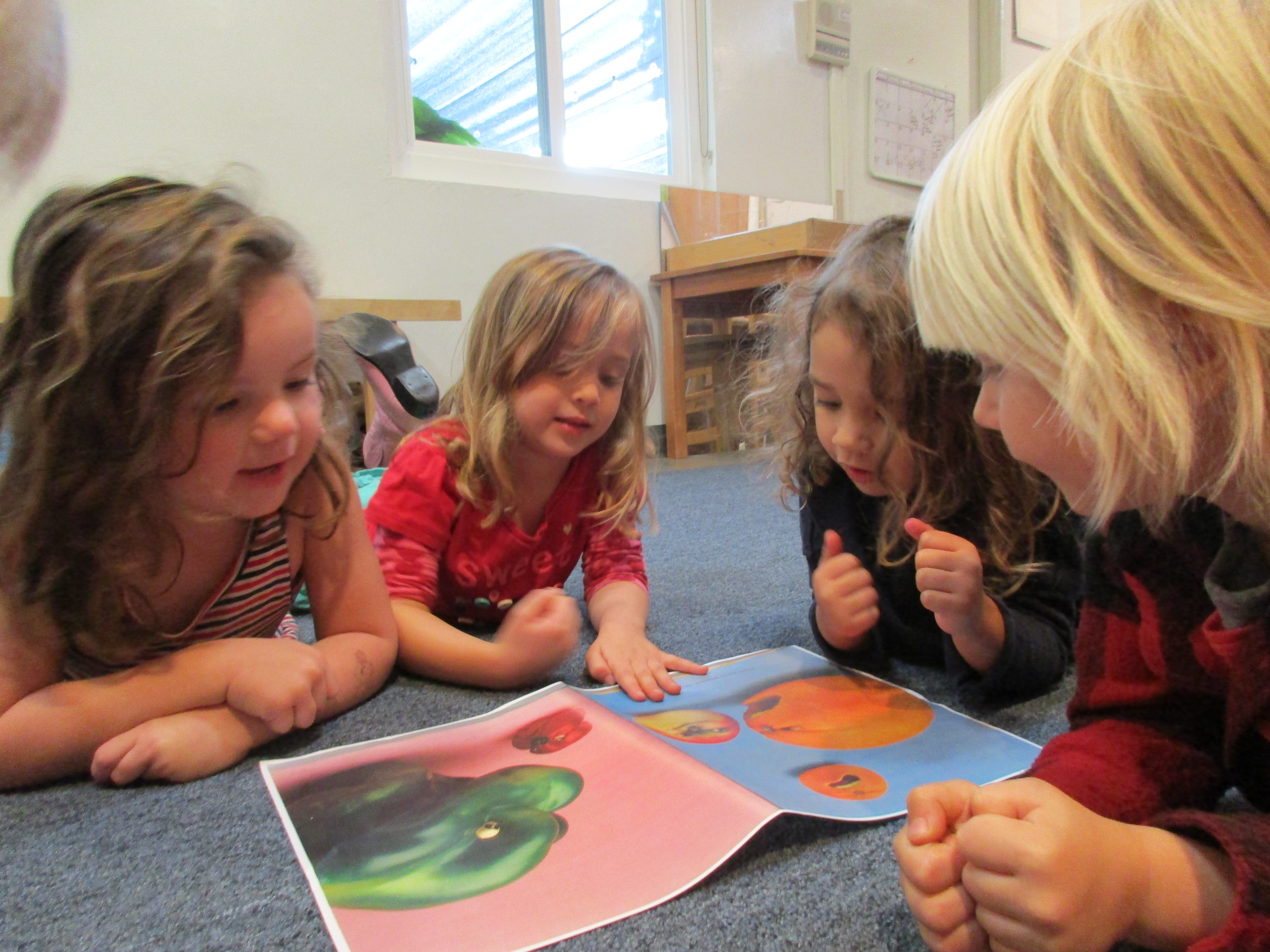 The children’s responses showed how they are developing their abilities to recognize, sympathize, and empathize with the emotions of others. The first step for many of the children is to be able to recognize and identify the perceived emotions that are displayed. Some were able to take it further by trying to understand the emotions through applying a story from their own lives that matched the feelings. Some even tried working out a scenario that would lead to a resolution to the imagined conflict. As teachers, we want to continue to support the children in developing the skills to create resolutions before they are in conflict. We are planning to copy and cut out the images from the book for the children to create new interactions to tell new stories and find new solutions. -Teacher Amy