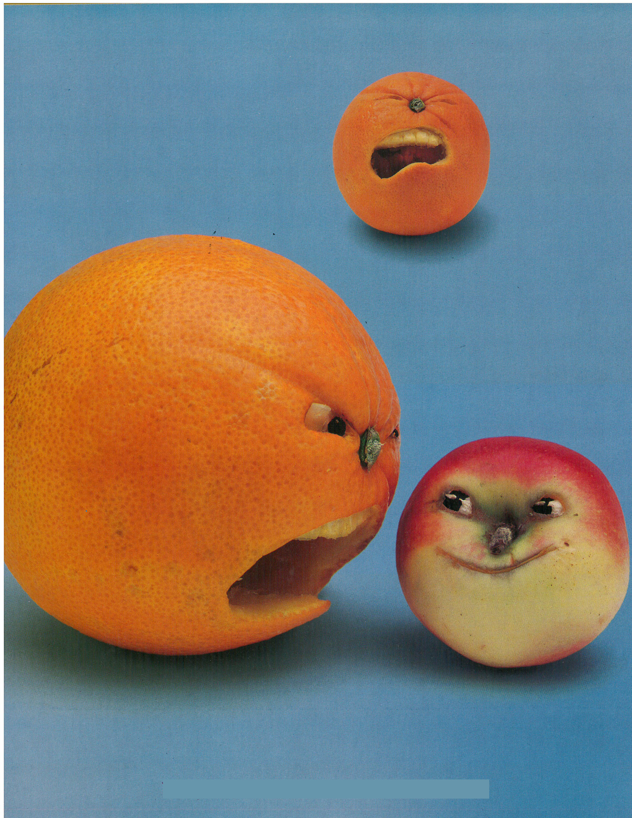 Isla: Maybe he (small orange) is his (apple) friend and he (small orange) is crying because someone is mad at his friend. Maybe he (apple) took something from him (big orange) or hit him, that’s why he’s mad. I don’t know why he’s happy.