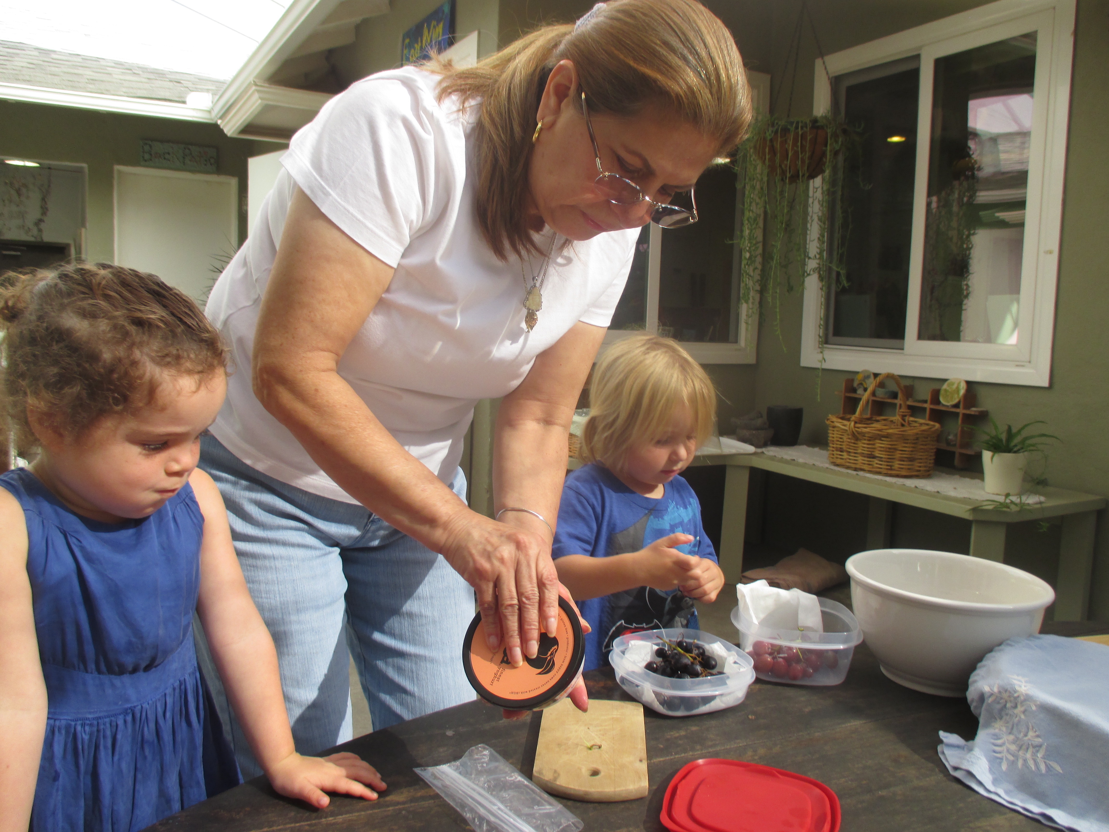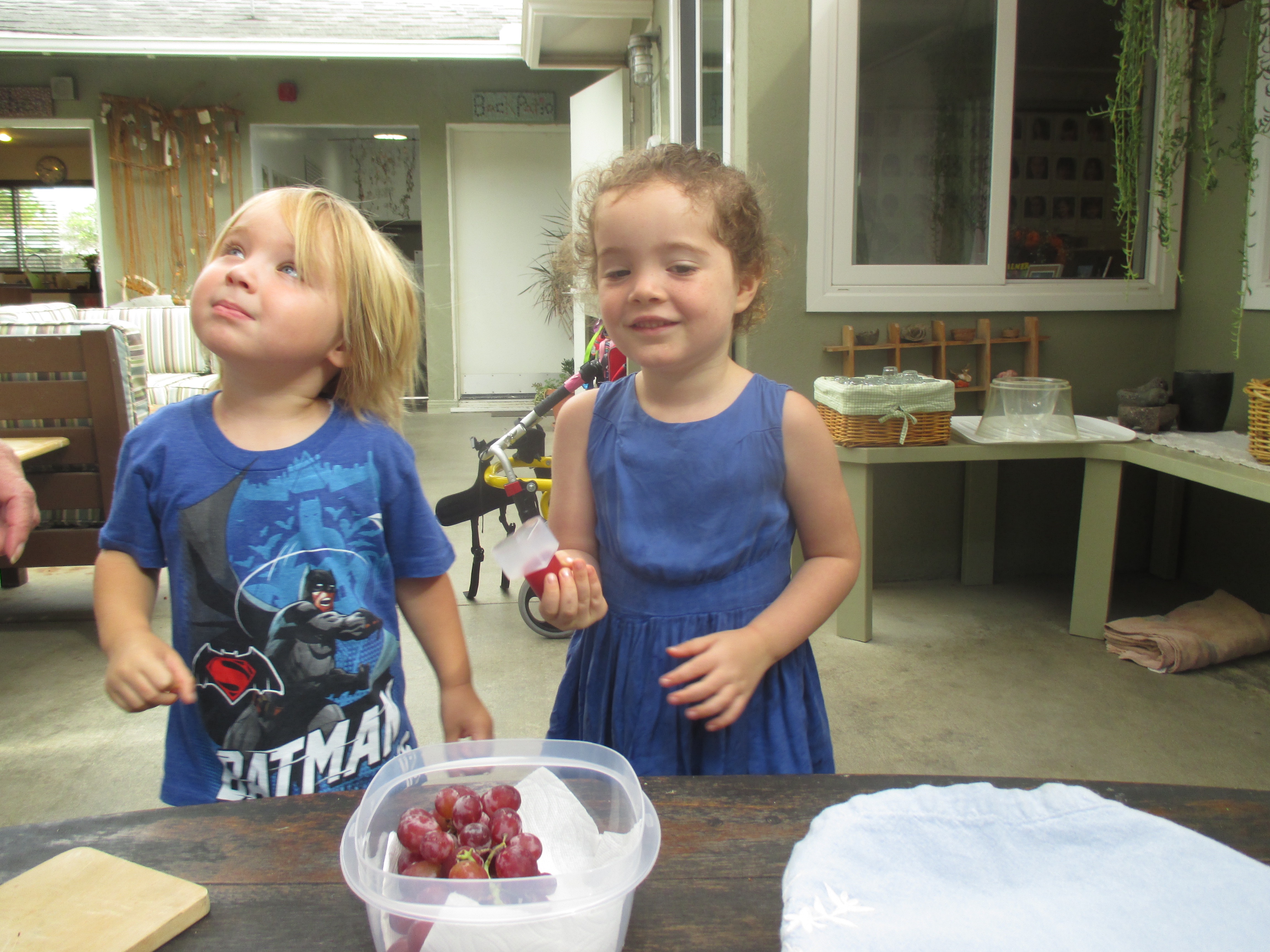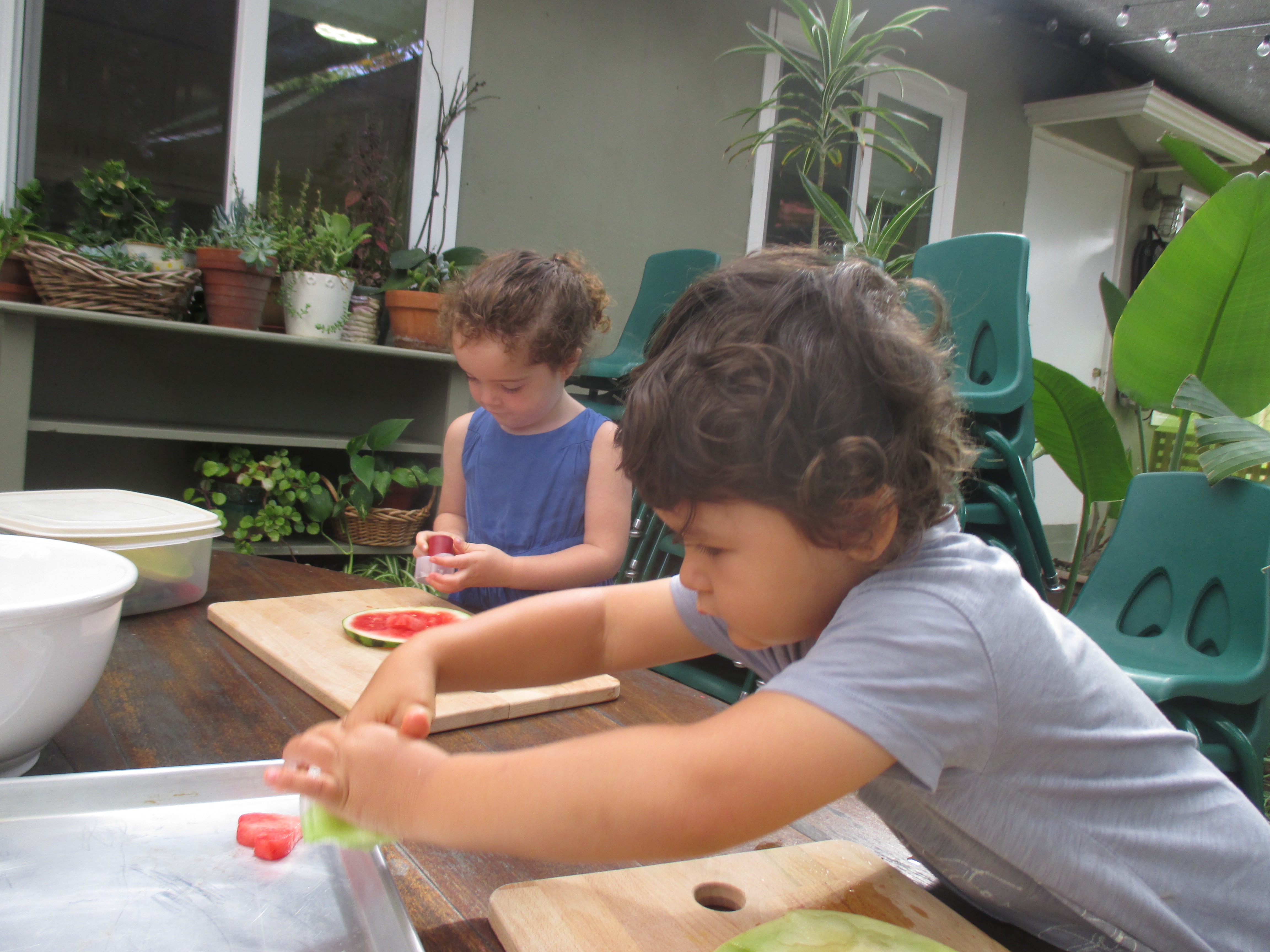 Today, Miro’s grandma, Elma, came to ‘cook with children’ in the middle courtyard. She and Miro, Willow and Dashiell prepared a fruit salad and cracker snack that was served at WW lunch. Children used shaped cutters on melons, chopped apples with knives and assembled raspberries and grapes in a sweet experience at school. Thank you, Elma and Miro!
