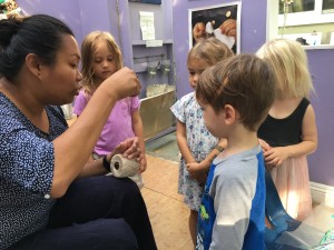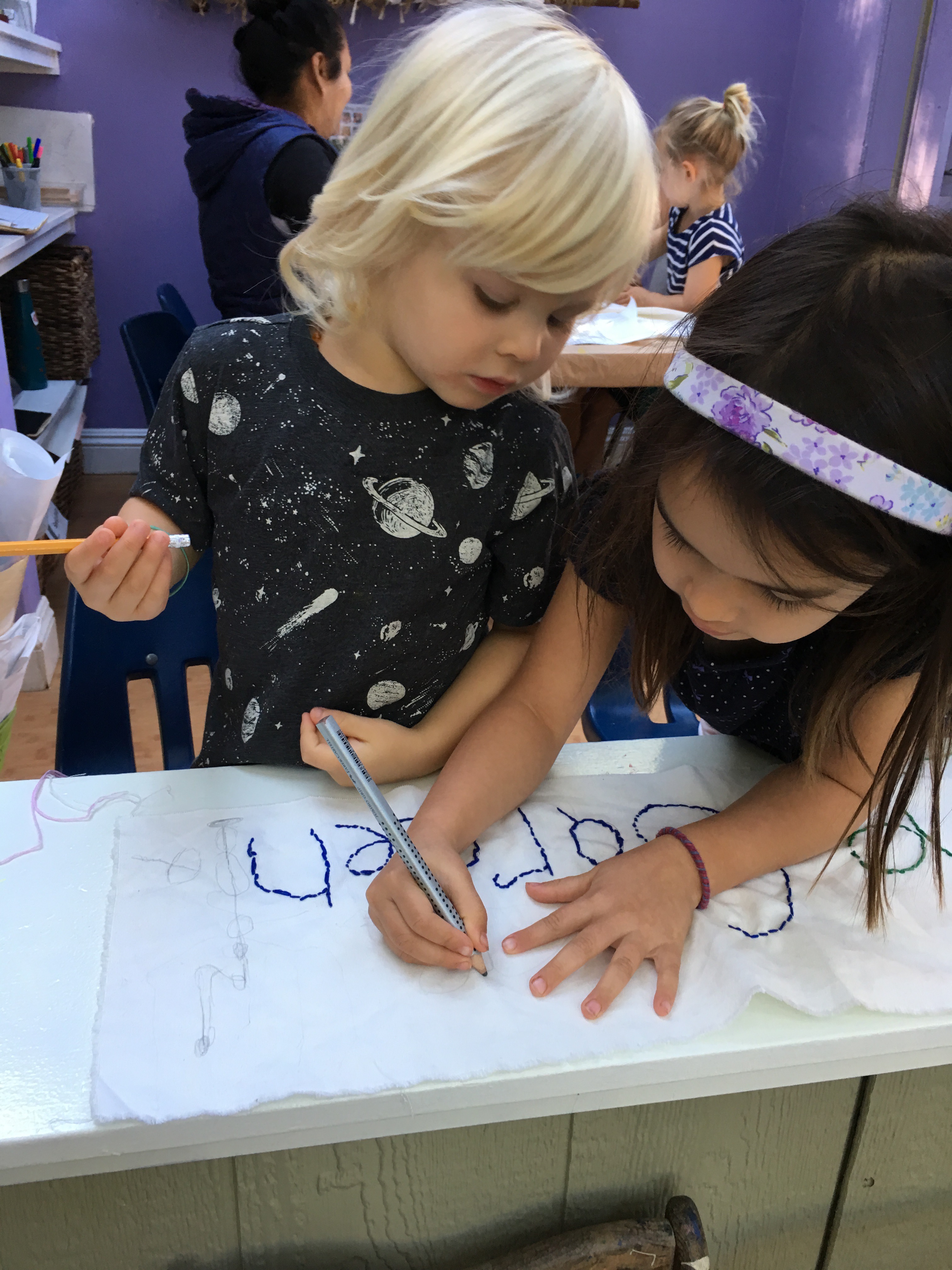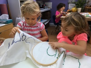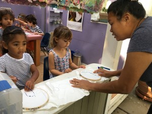 After writing the letters on fabric, Teacher Katherine facilitated embroidery.