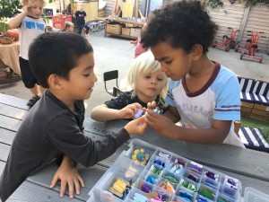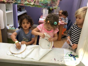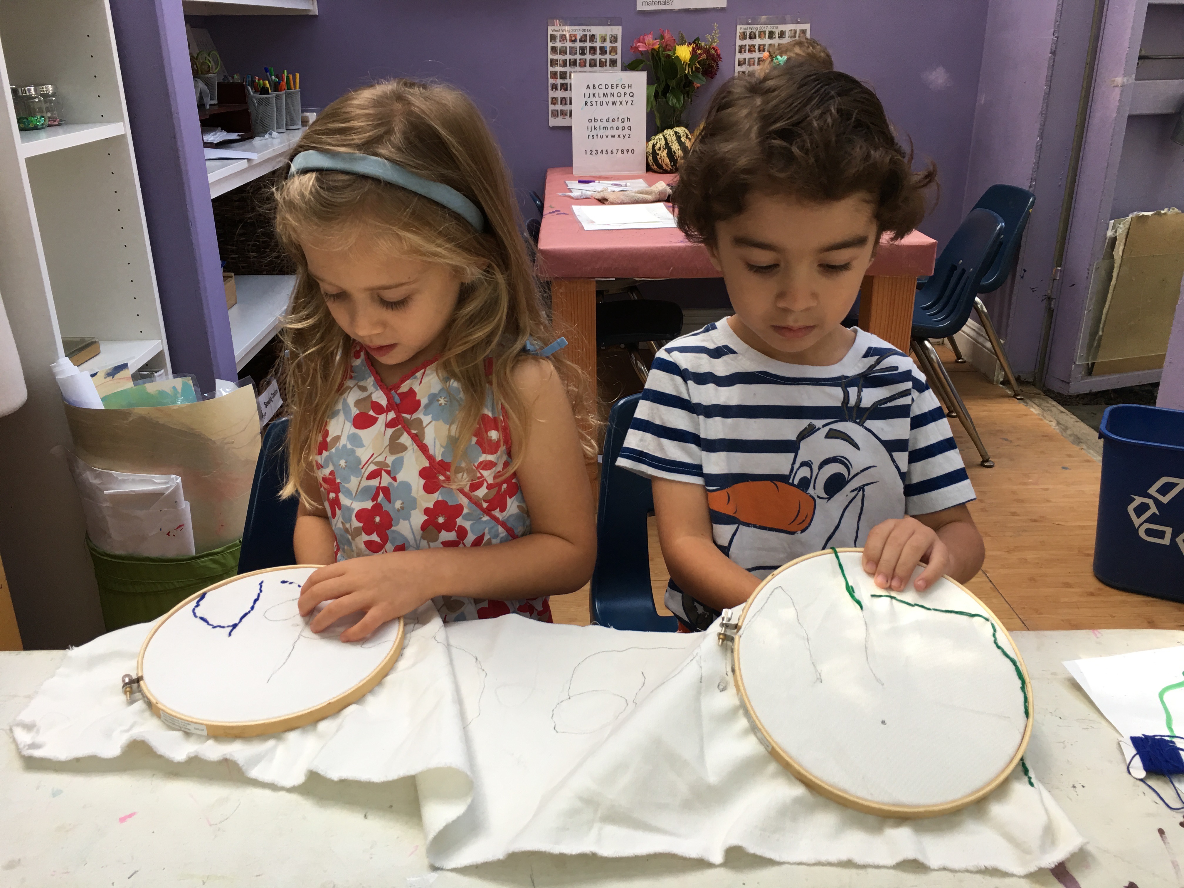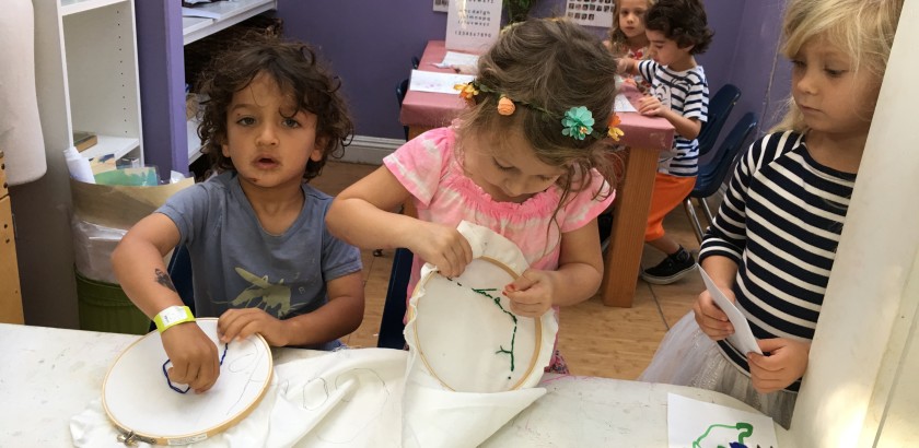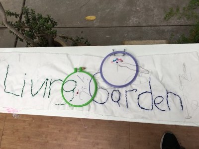 The Living Garden sign supported the children in a sustained interest with an unfamiliar technique: embroidery.  Providing them the opportunity for extension of time gave them the possibility for adding layers of meaning to the sign.  It also added a space for both East and West Wingers to experience a journey in learning together based on a common interest. Making the sign together supported the children in understanding the common connection to the Living Garden and helped them to persevere imbuing resiliency and collaboration. -Teacher Adriana