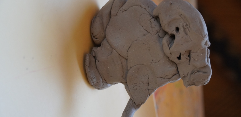 Rondie: I made Elliot (who he sees through the Atelier glass door in the sand). I squished the clay with my hands. I had to use a sharp shaving tool to poke holes. The holes are eyes and I scratched for the eyebrows.