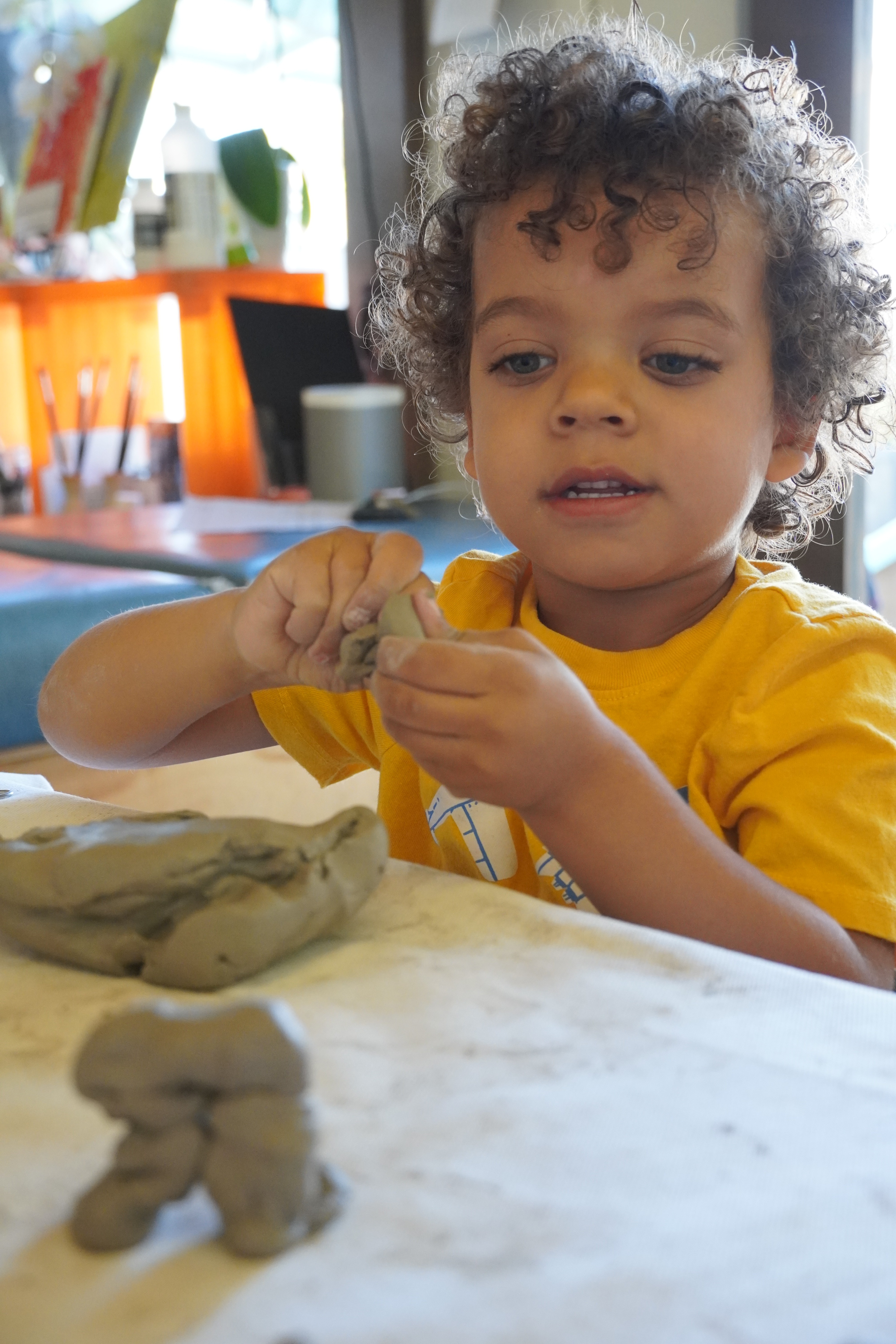 Rondie: I made Elliot (who he sees through the Atelier glass door in the sand). I squished the clay with my hands. I had to use a sharp shaving tool to poke holes. The holes are eyes and I scratched for the eyebrows.
