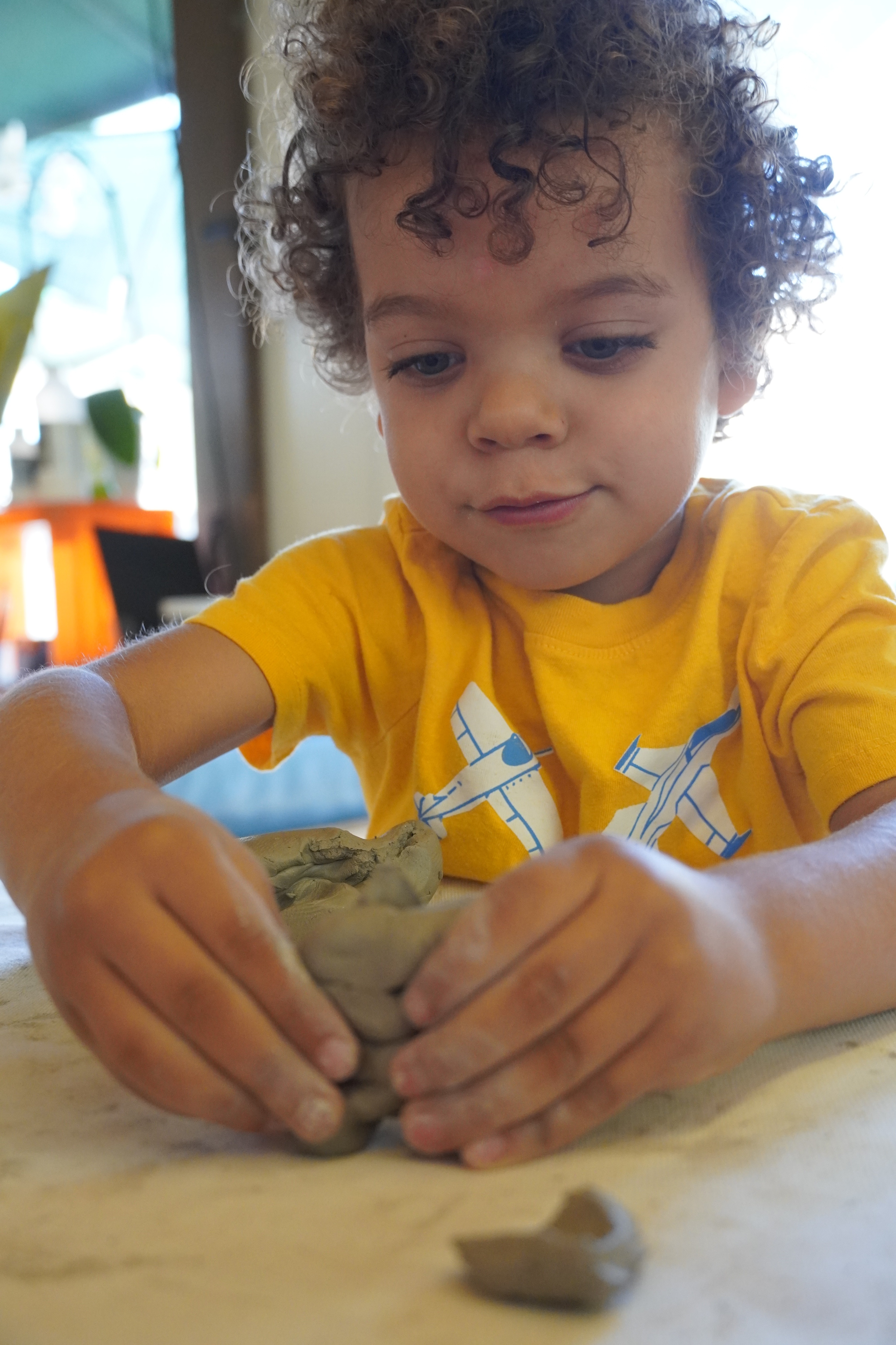 Rondie: I made Elliot (who he sees through the Atelier glass door in the sand). I squished the clay with my hands. I had to use a sharp shaving tool to poke holes. The holes are eyes and I scratched for the eyebrows.