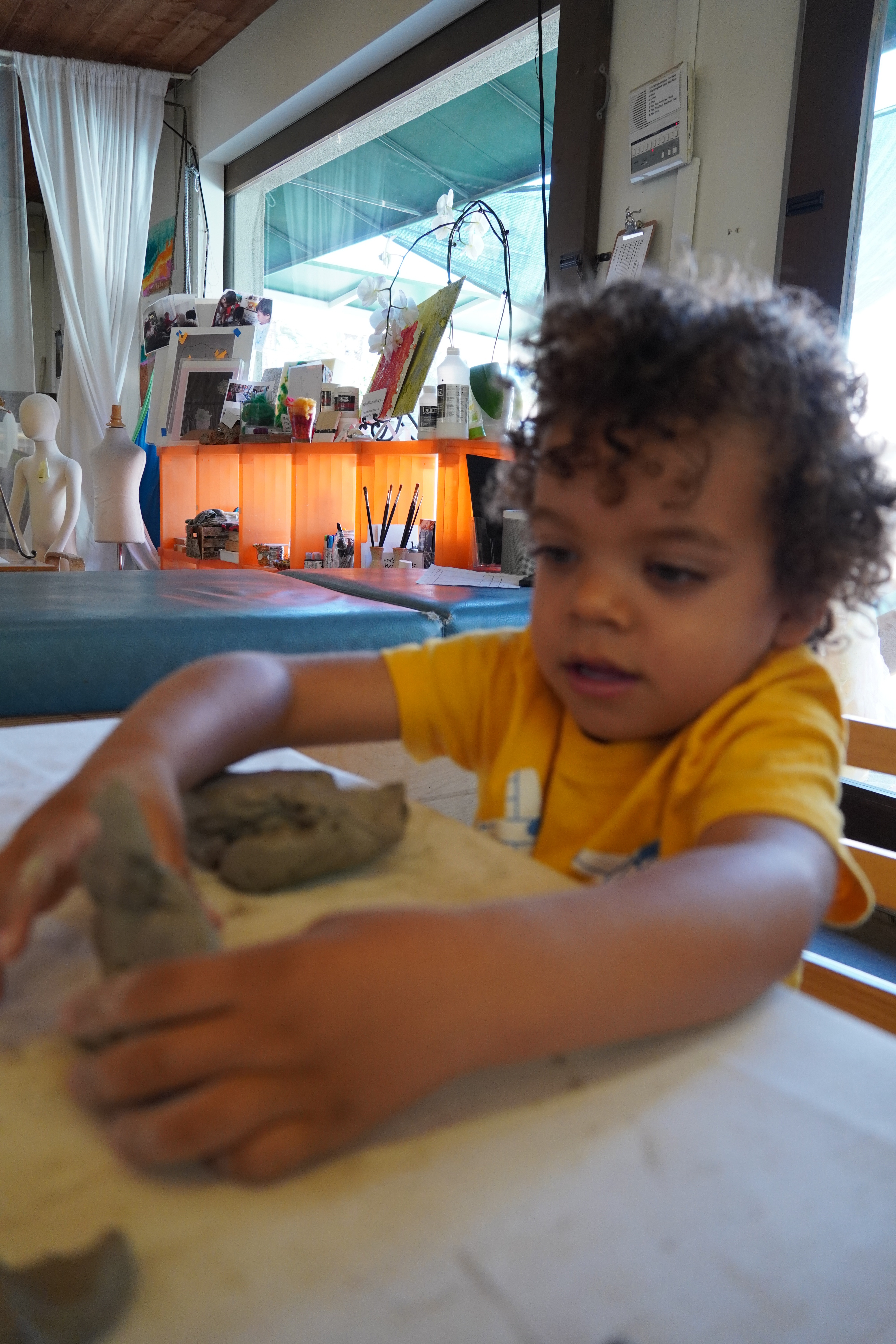 Rondie: I made Elliot (who he sees through the Atelier glass door in the sand). I squished the clay with my hands. I had to use a sharp shaving tool to poke holes. The holes are eyes and I scratched for the eyebrows.