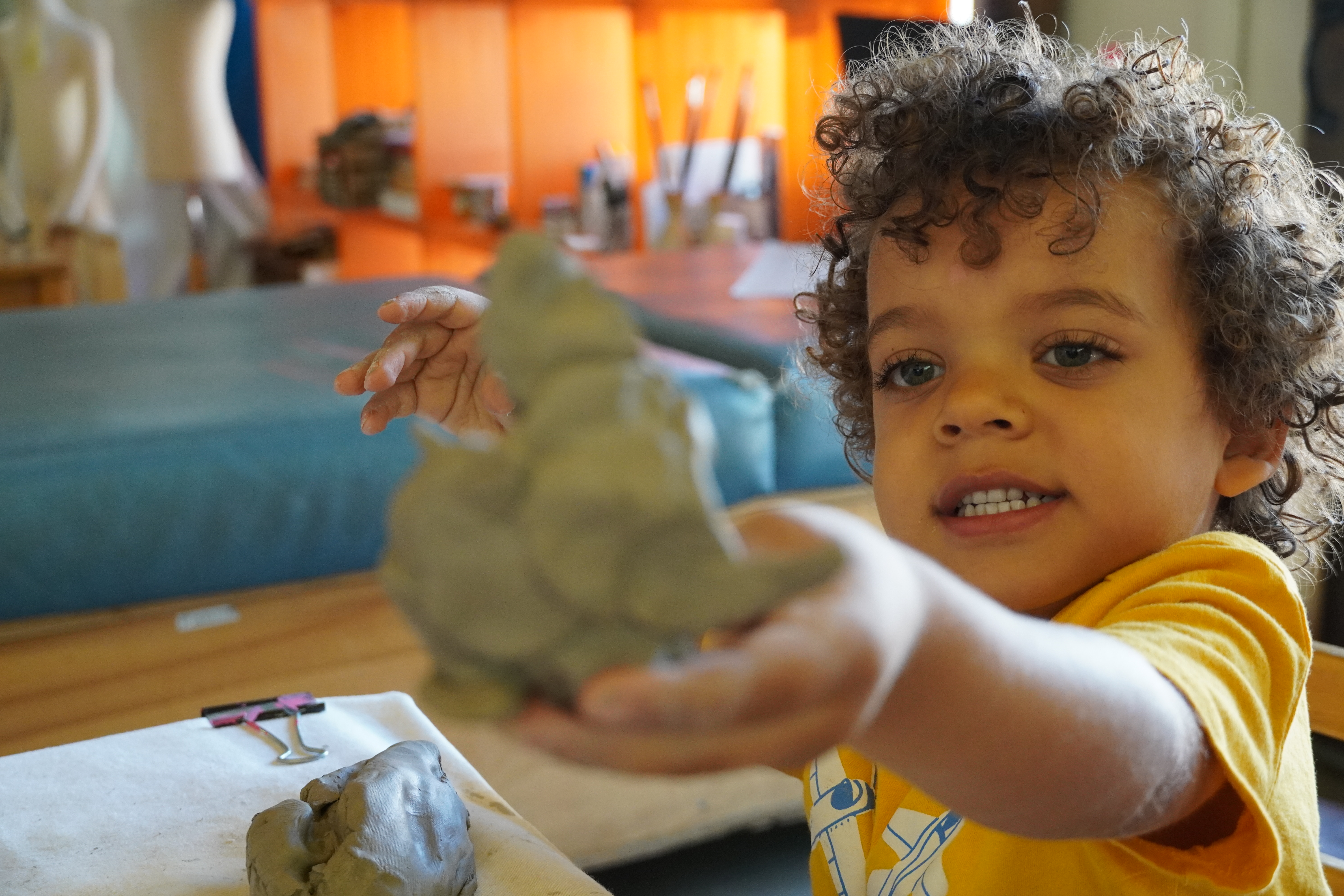 Rondie: I made Elliot (who he sees through the Atelier glass door in the sand). I squished the clay with my hands. I had to use a sharp shaving tool to poke holes. The holes are eyes and I scratched for the eyebrows.