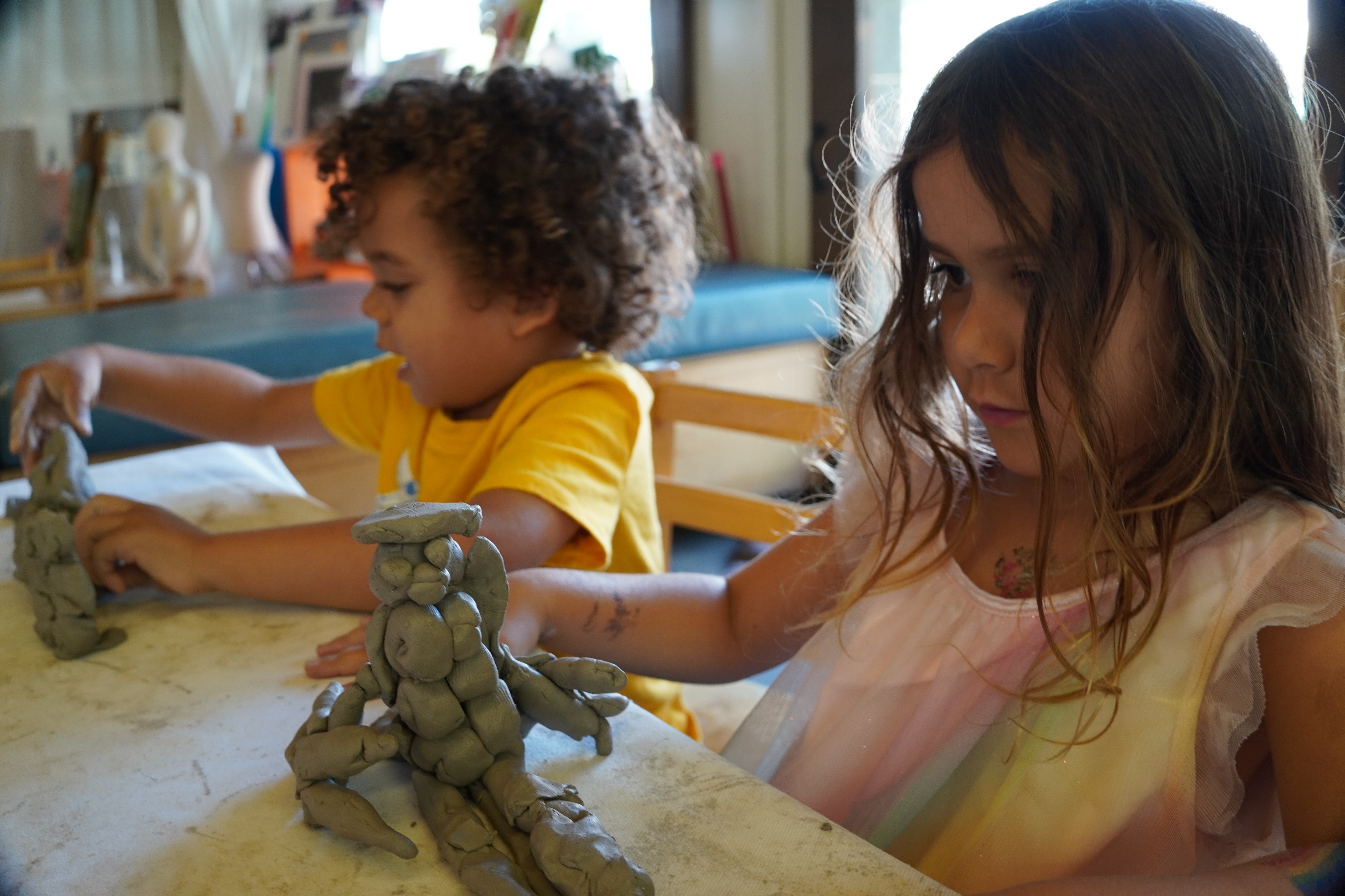 The children were able to solve some of the challenges of upright figures by making them small or wide or sitting down. As their skills with clay develop, and their familiarity with tools increases, I expect that we will see even more sophisticated figures in the future. – Amy